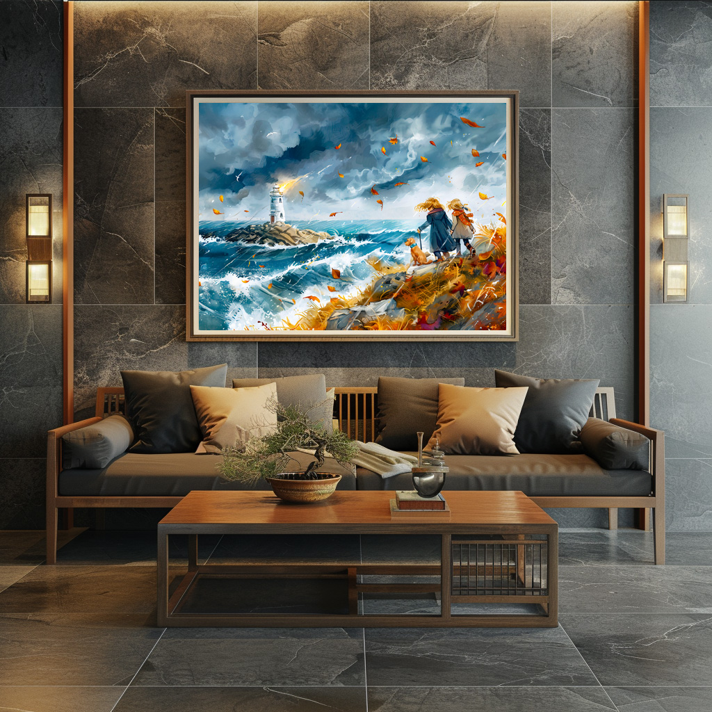 watercolor painting capturing a view of the lighthouse during an autumn storm from a cliff, with two girls and their dog