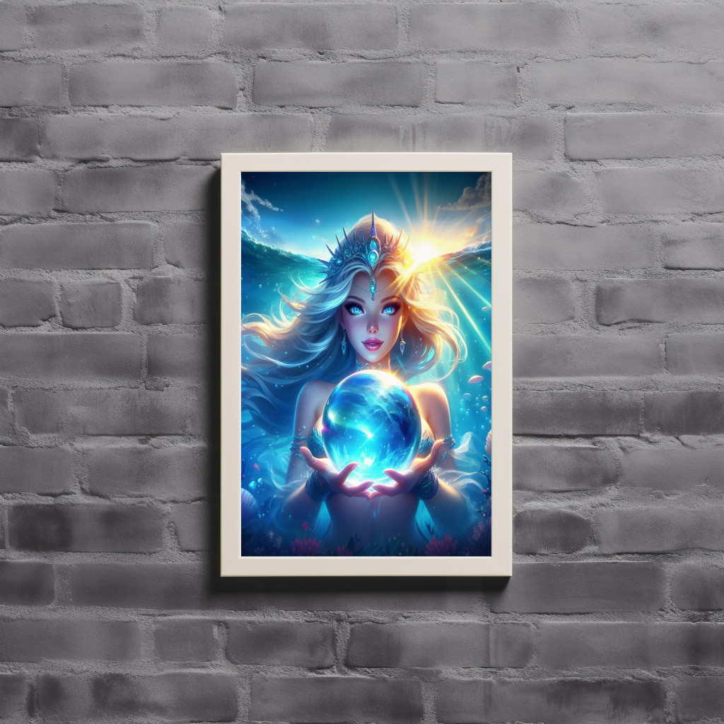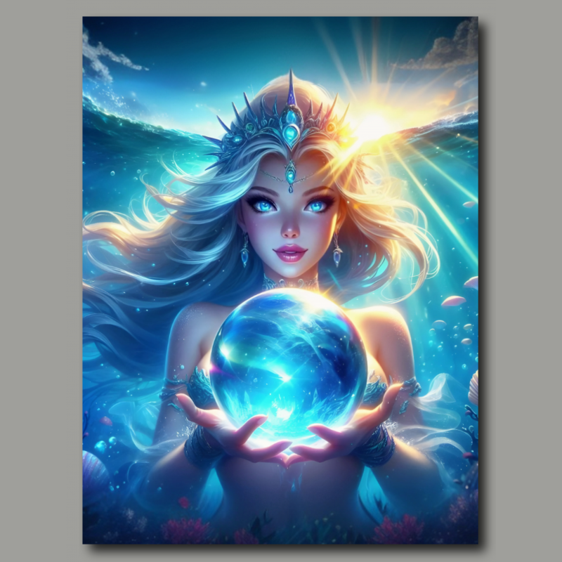 La encantadora Nixia presenta una bola de cristal azul bajo el agua. Su visión desprende magia en la suave danza de las corrientes marinas.