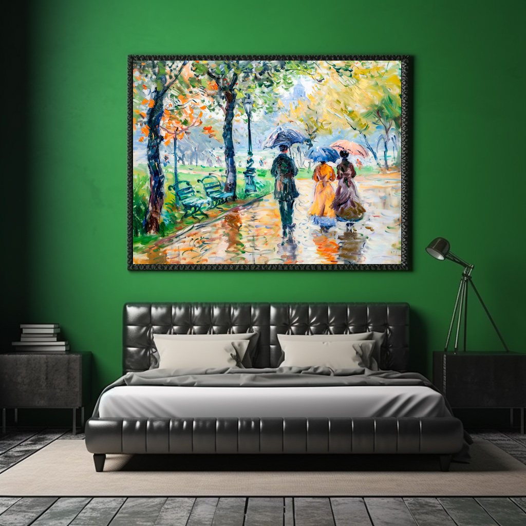 Impressionist painting of people walking with umbrellas in a park, soft colors and gentle rainy mood.