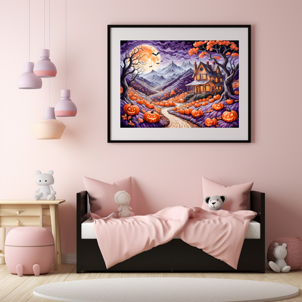 "Spooky Halloween Villa with Pumpkins and Bats" by Anja Frost