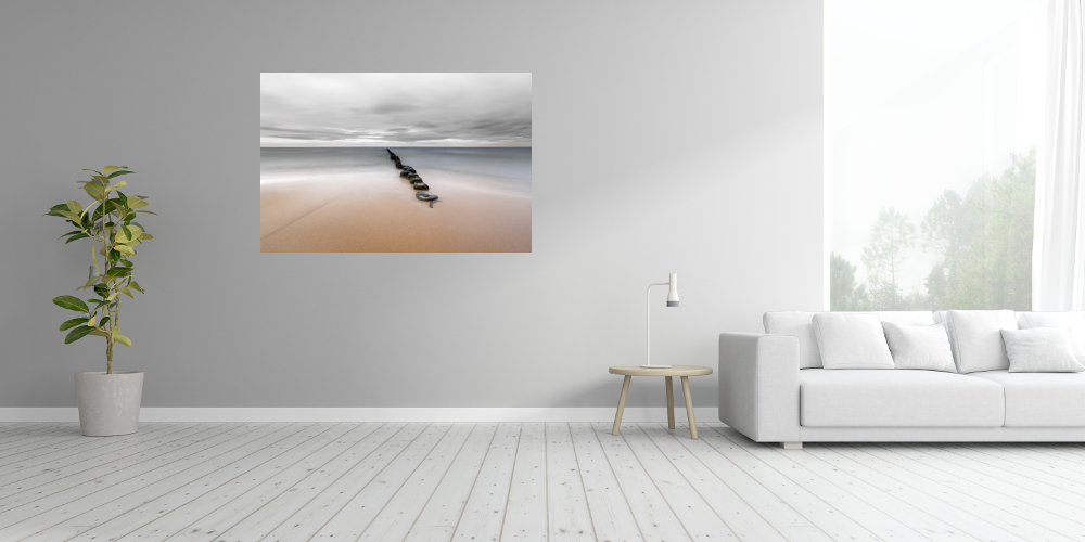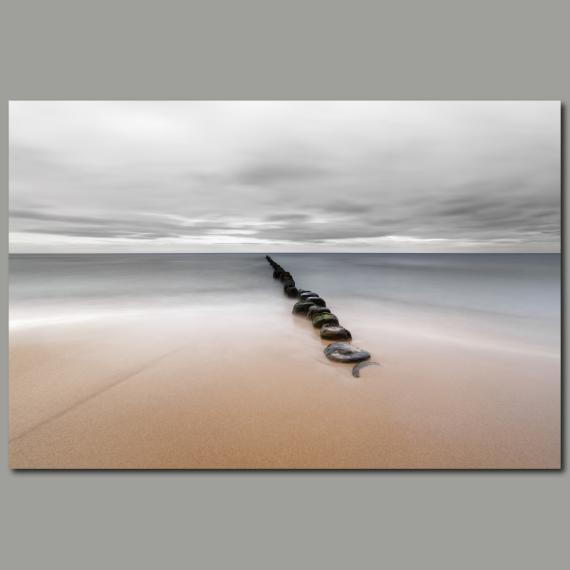 Playa tranquila tomada desde la costa del Mar Báltico con una hilera de espigones que dirigen la vista hacia el horizonte, la superficie del agua está suavizada por la larga exposición, estructuras de nubes gris claro.