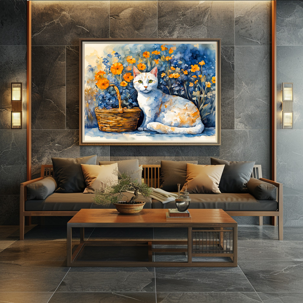 delicate watercolor painting of a white cat sitting in a flower-filled basket. Soft colors and intricate details make this a charming composition.