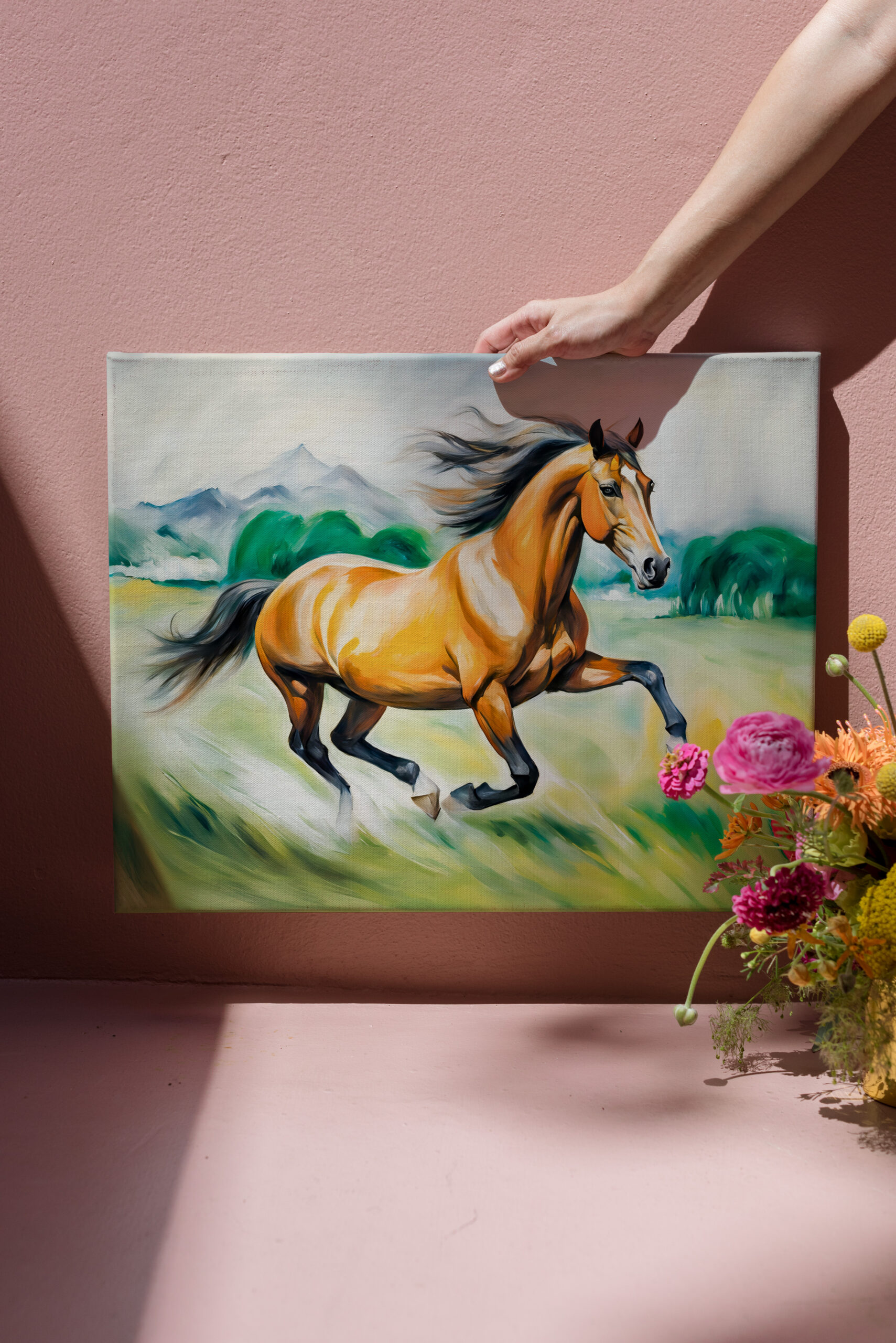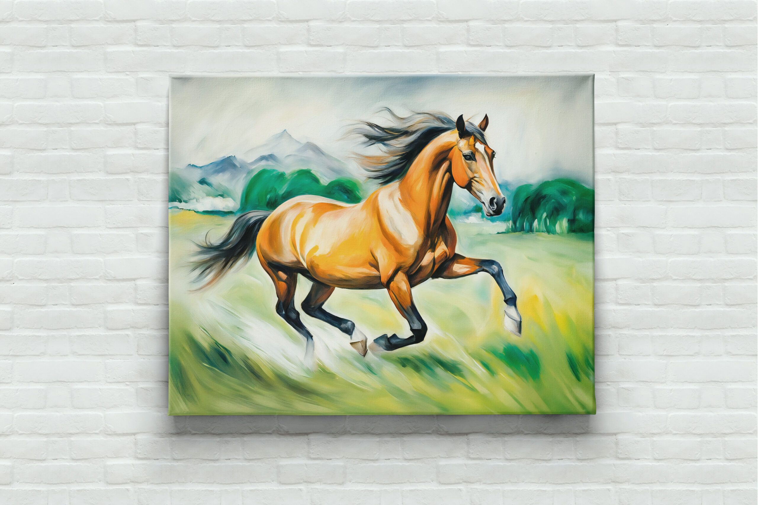 vibrant oil painting of a brown horse galloping through a lush green meadow, capturing movement and vitality with expressive brushstrokes.