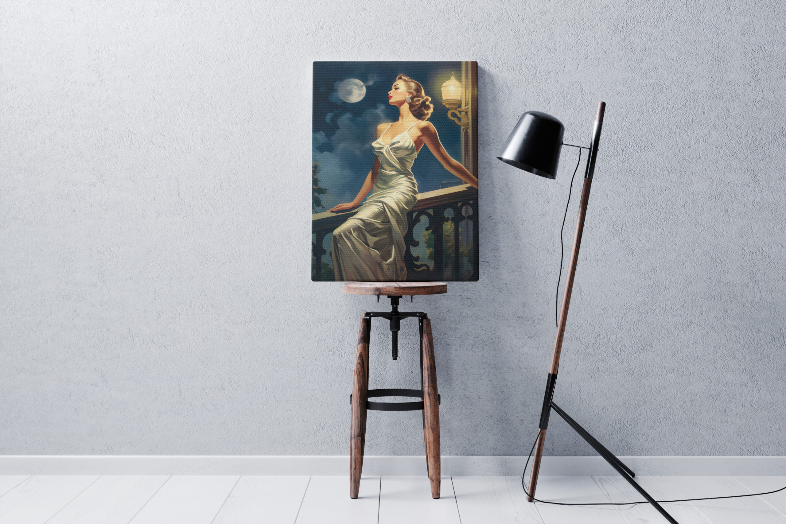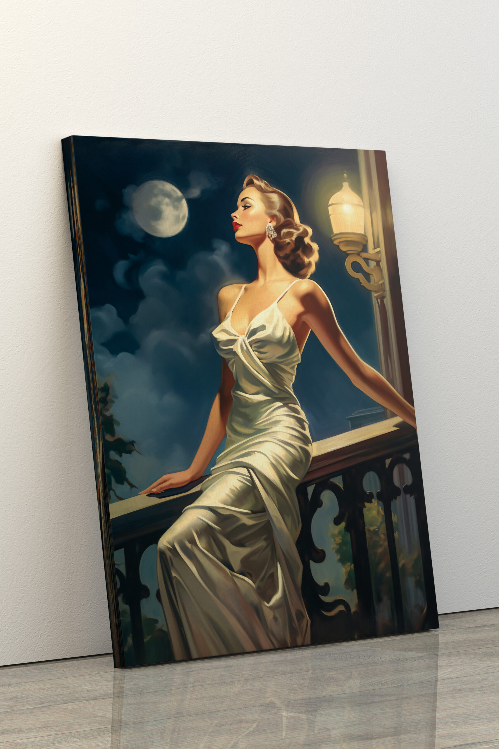 In diesem Bild ist eine elegante Frau in einem figurbetonten, weißen Abendkleid zu sehen, die auf einem Balkon sitzt und in den Nachthimmel schaut. Der Mond leuchtet im Hintergrund und es gibt eine nostalgische Atmosphäre.