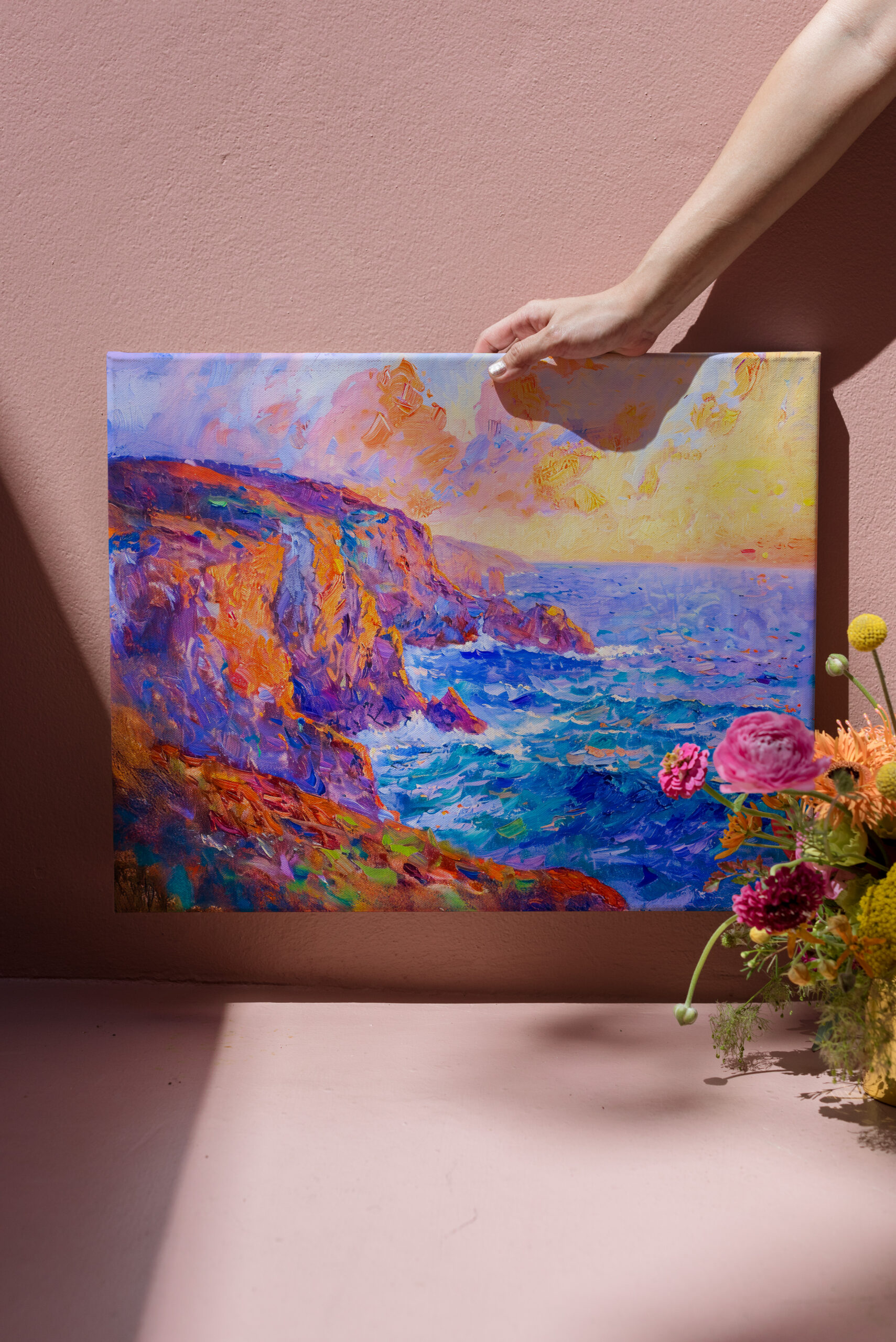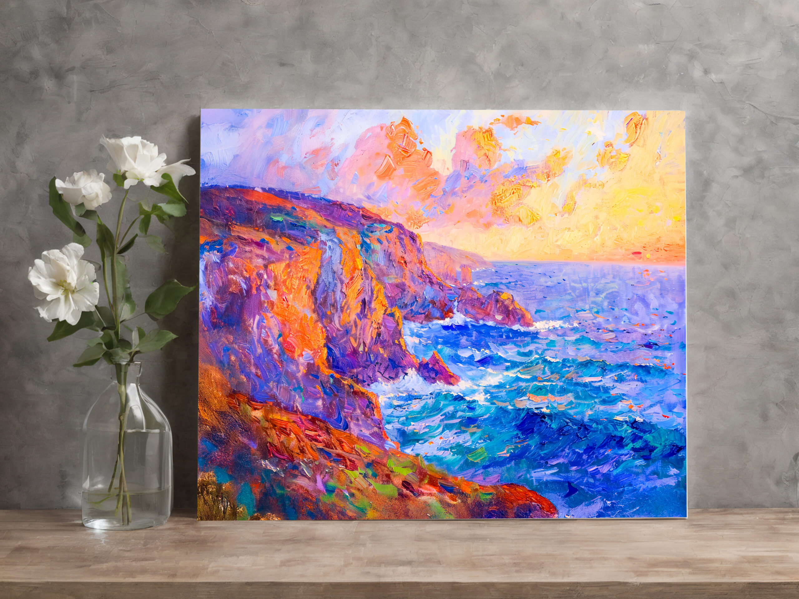 impressionist painting of cliffs illuminated by a fiery sunset. The bold colors, dramatic sky, and textured brushstrokes create a breathtaking coastal scene.