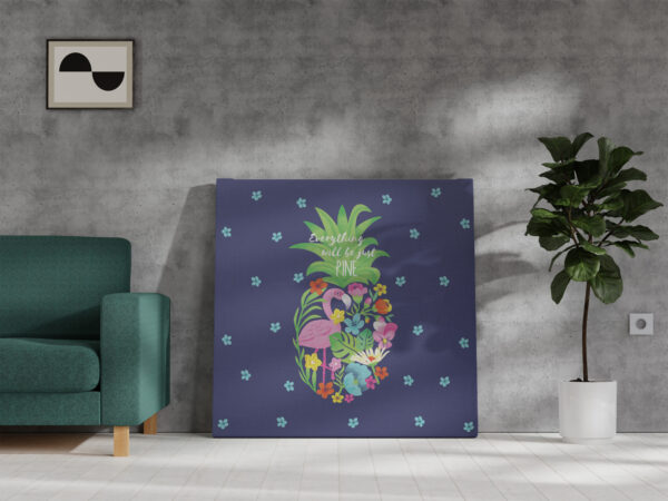Divertida piña en brillantes colores rellena de un paraíso tropical de flores y un pelícano camuflado