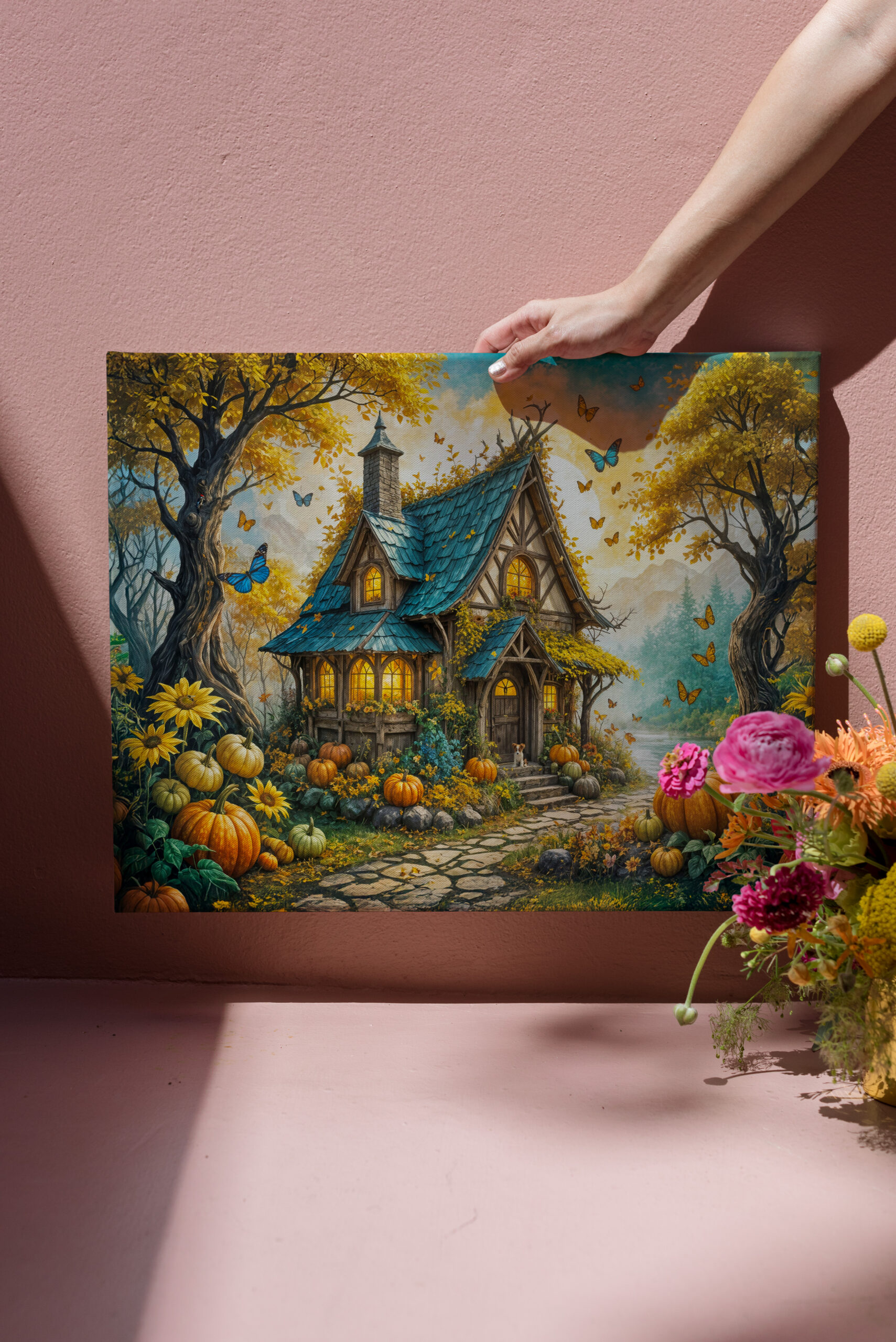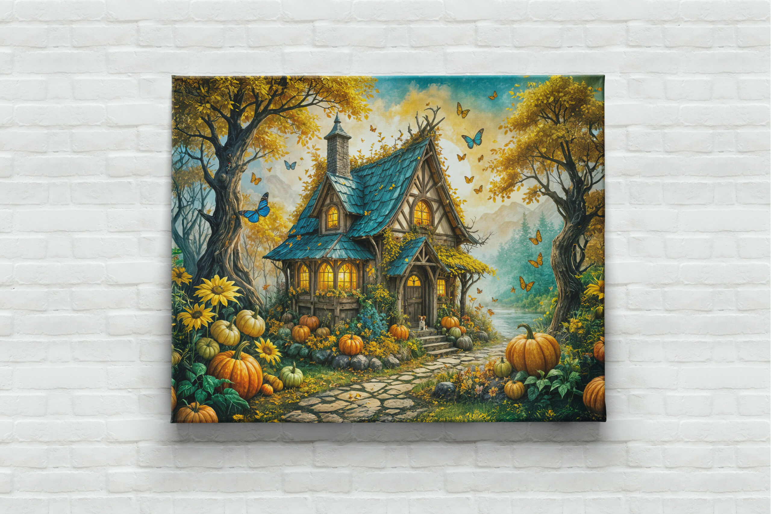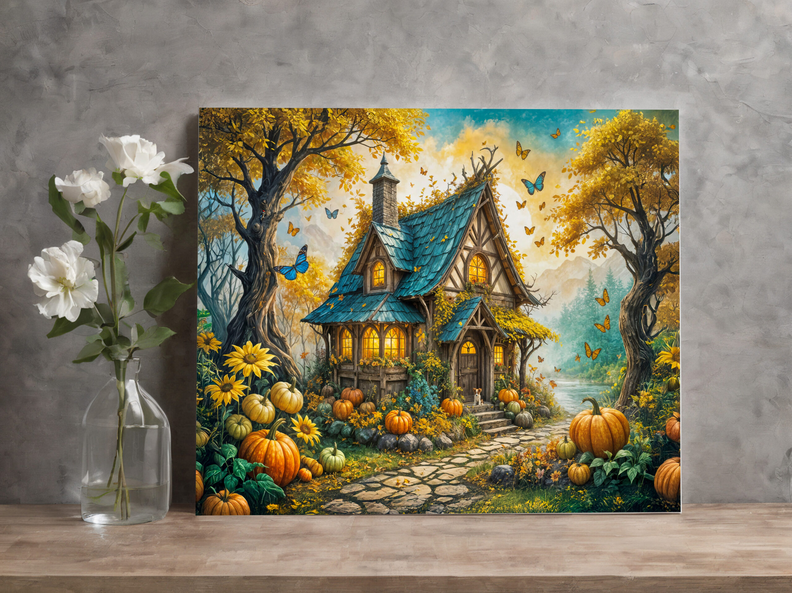 "Enchanting Autumn Cottage with Pumpkins" by Anja Frost