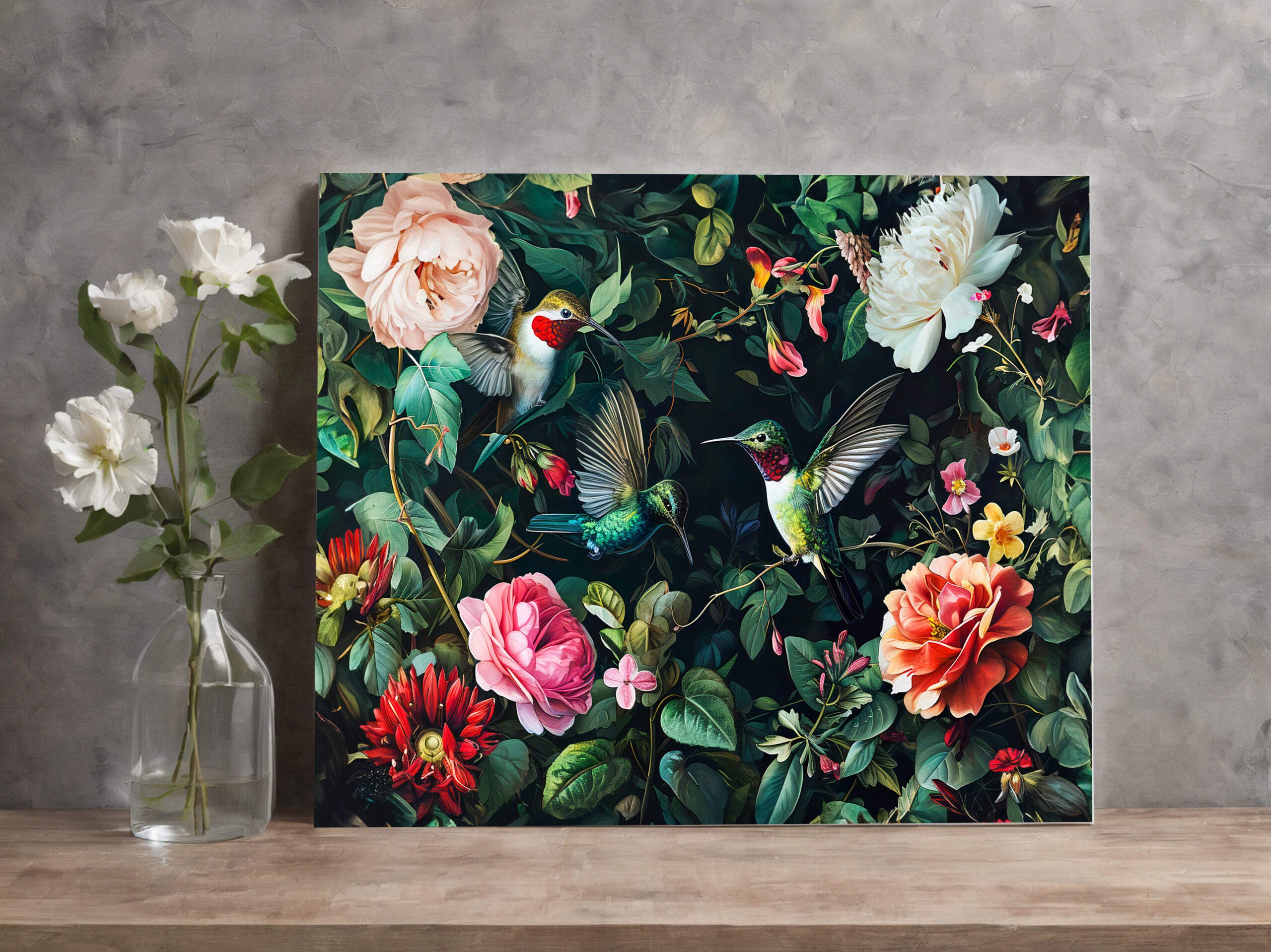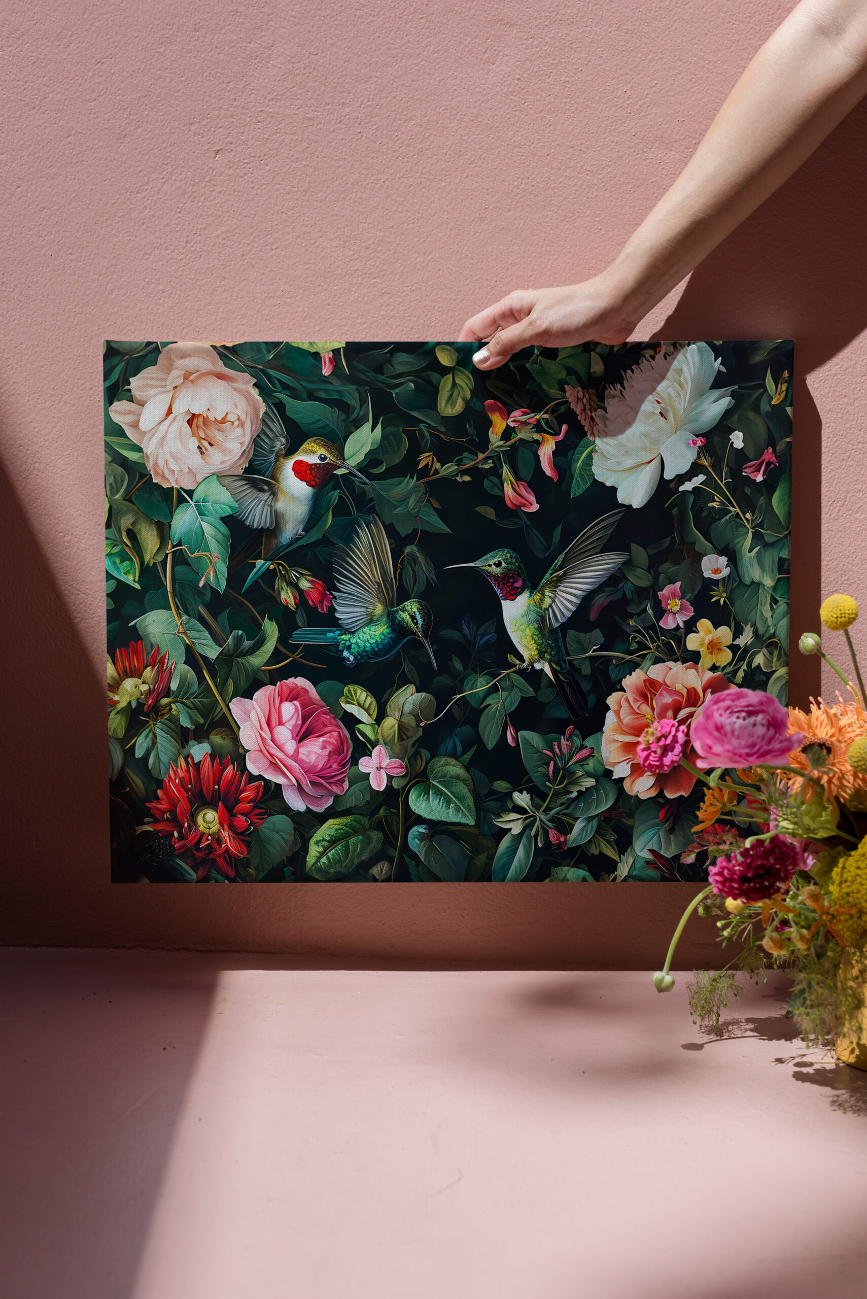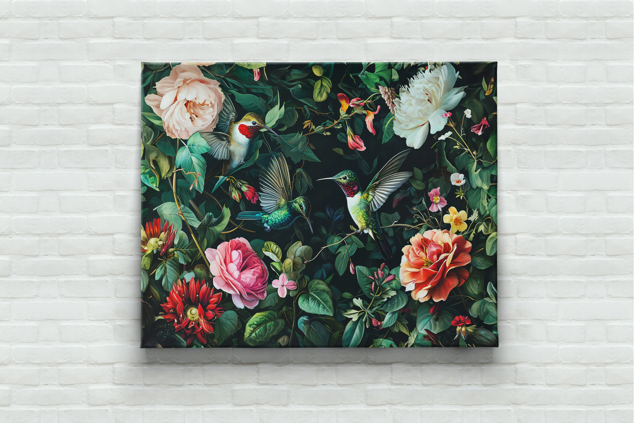 "Hummingbirds with Climbing Vines and Rose Hedge Illustration" by Anja Frost