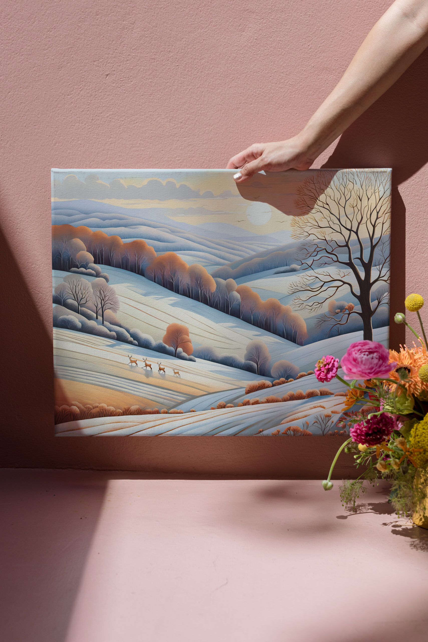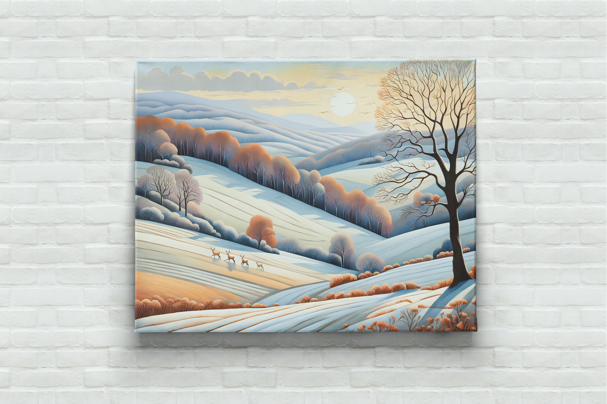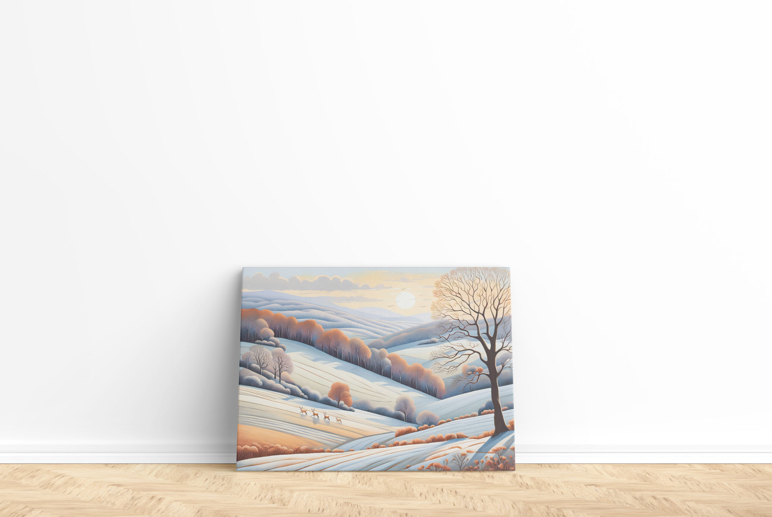 Sunny winter landscape with rolling hills covered in snow. Gentle sunlight casts a warm glow over the picturesque countryside. Pastel watercolor style.