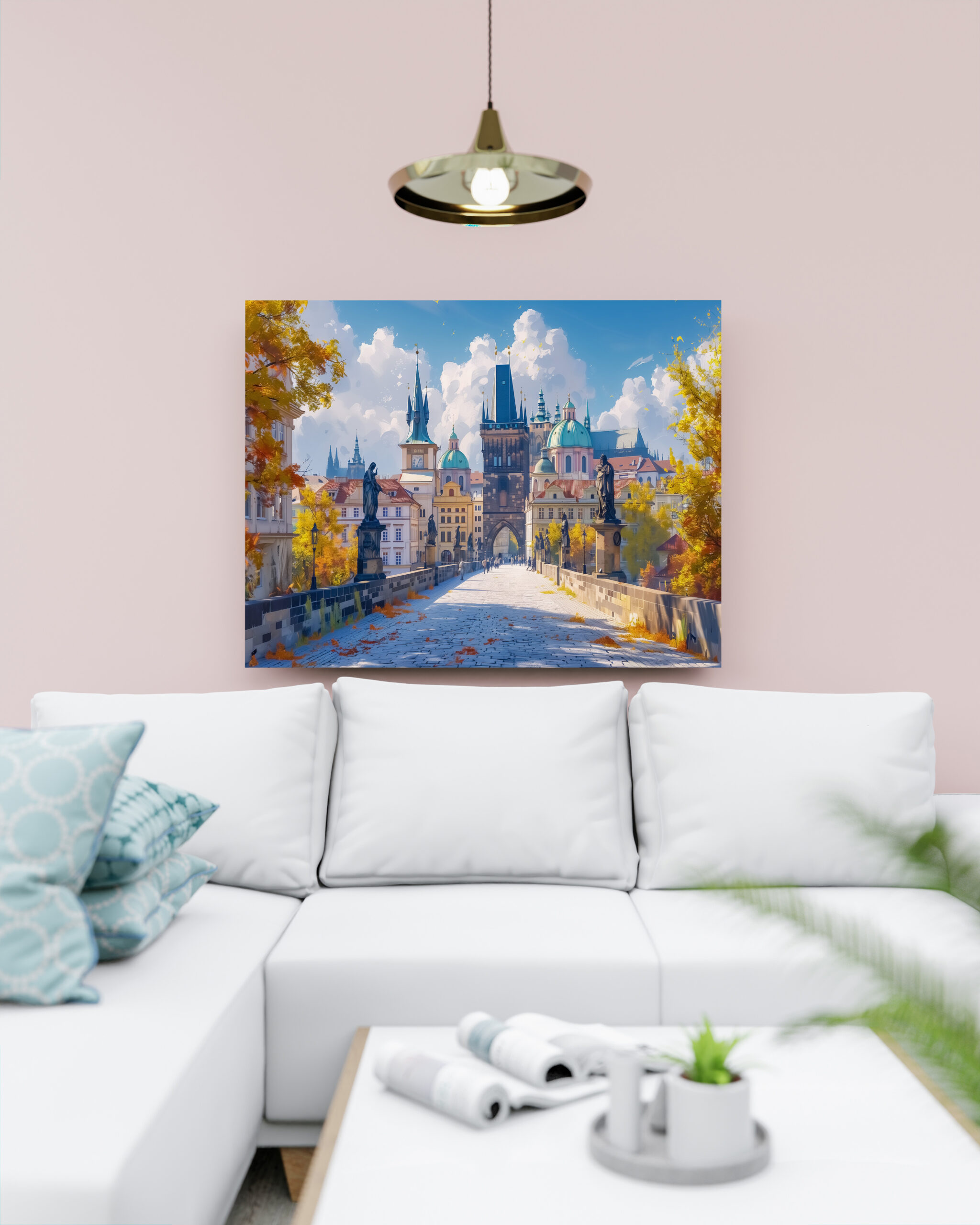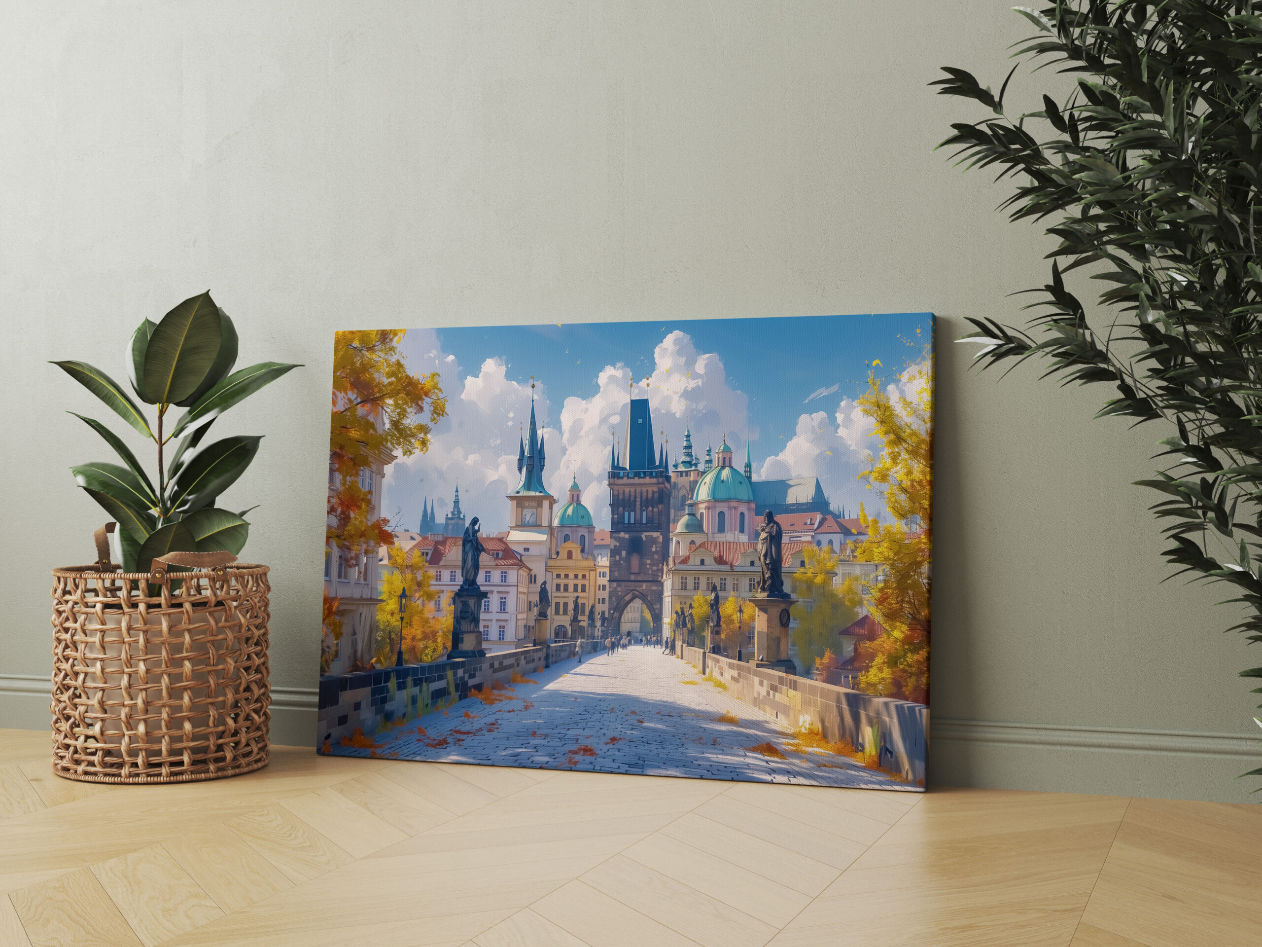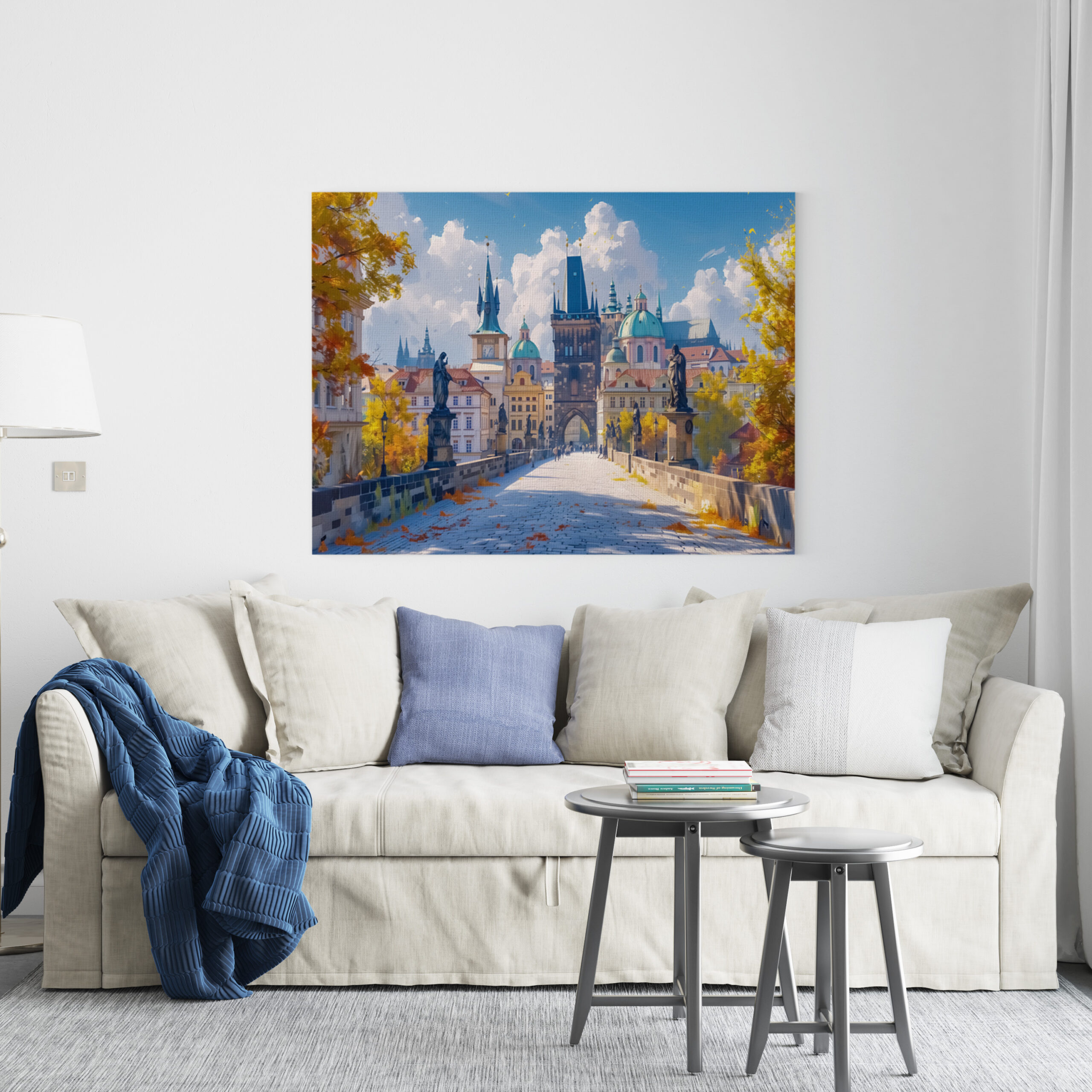 Erleben Sie die zeitlose Schönheit der Karlsbrücke in Prag. Dieses atemberaubende Kunstwerk zeigt die ikonische Brücke, umgeben von herbstlich gefärbten Bäumen und einer eindrucksvollen Kulisse historischer Architektur.