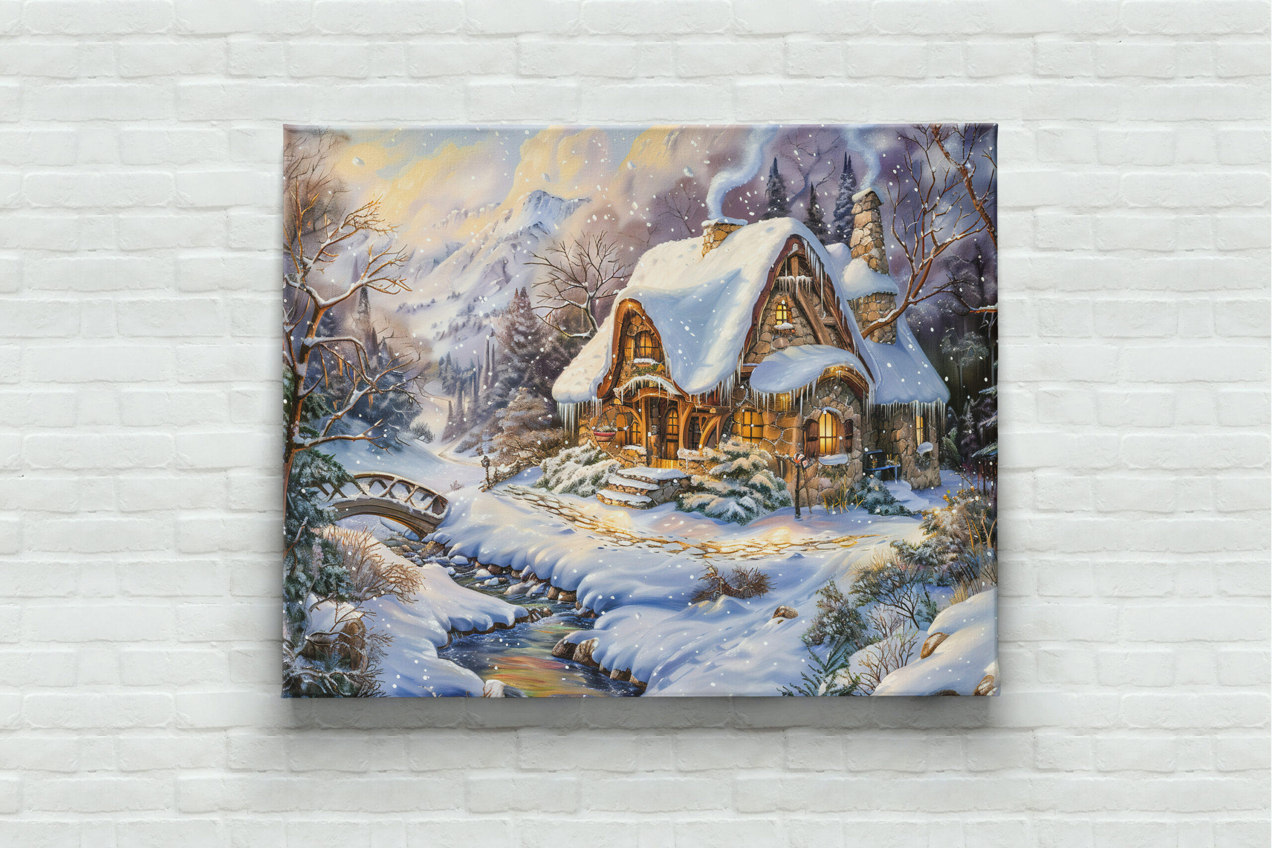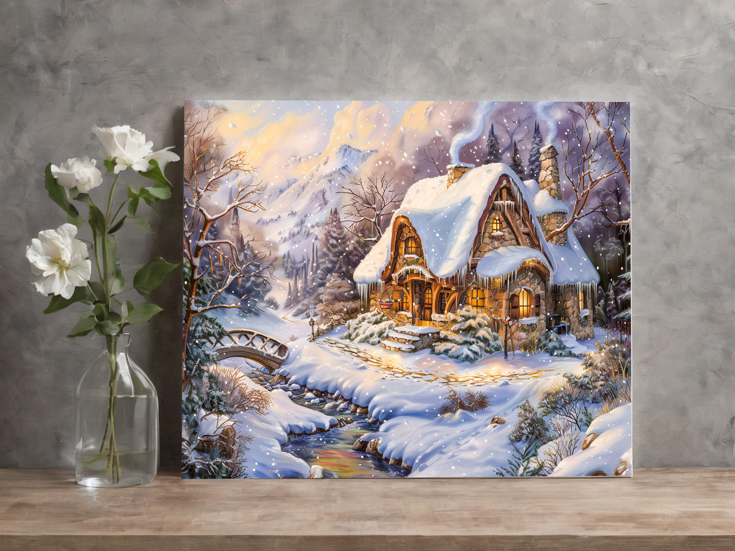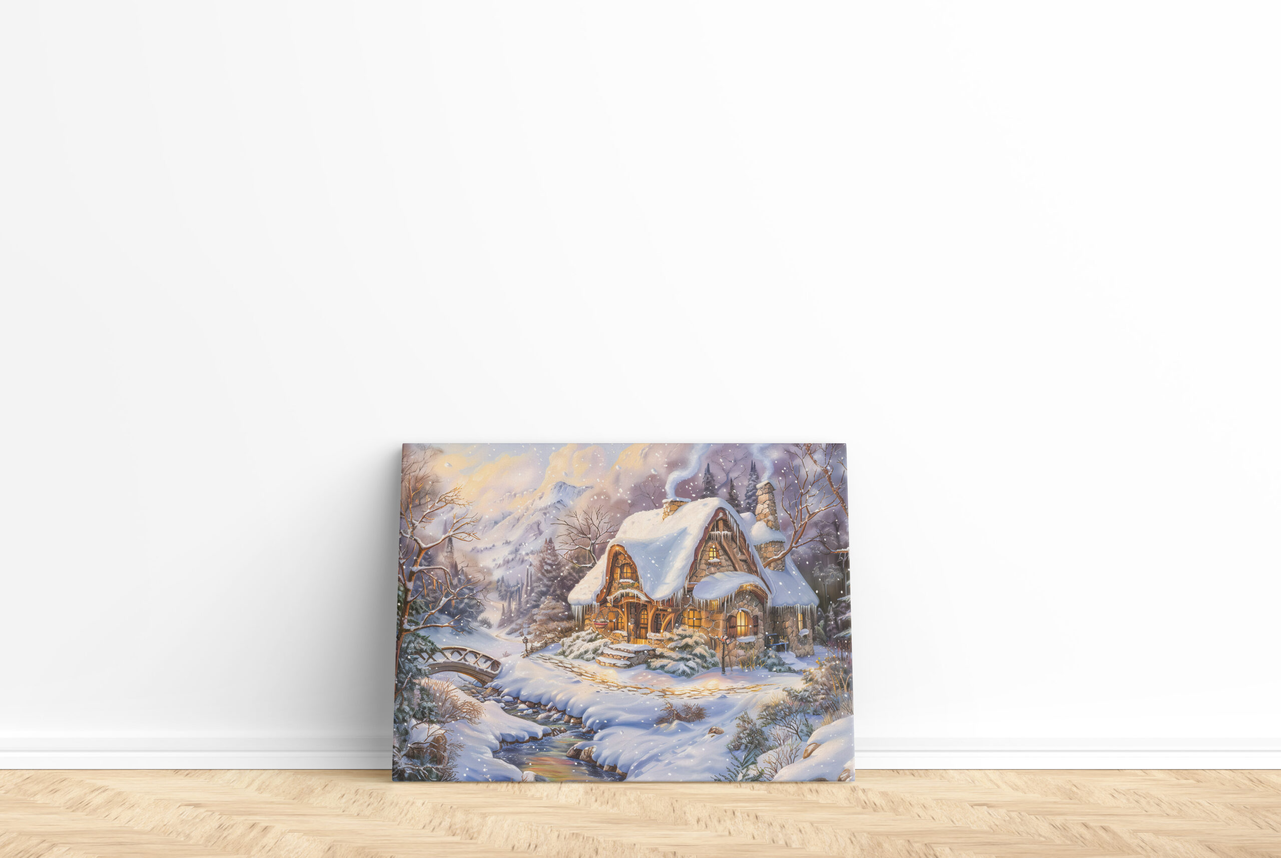 "Snowy Mountain Cottage by Stream" by Anja Frost