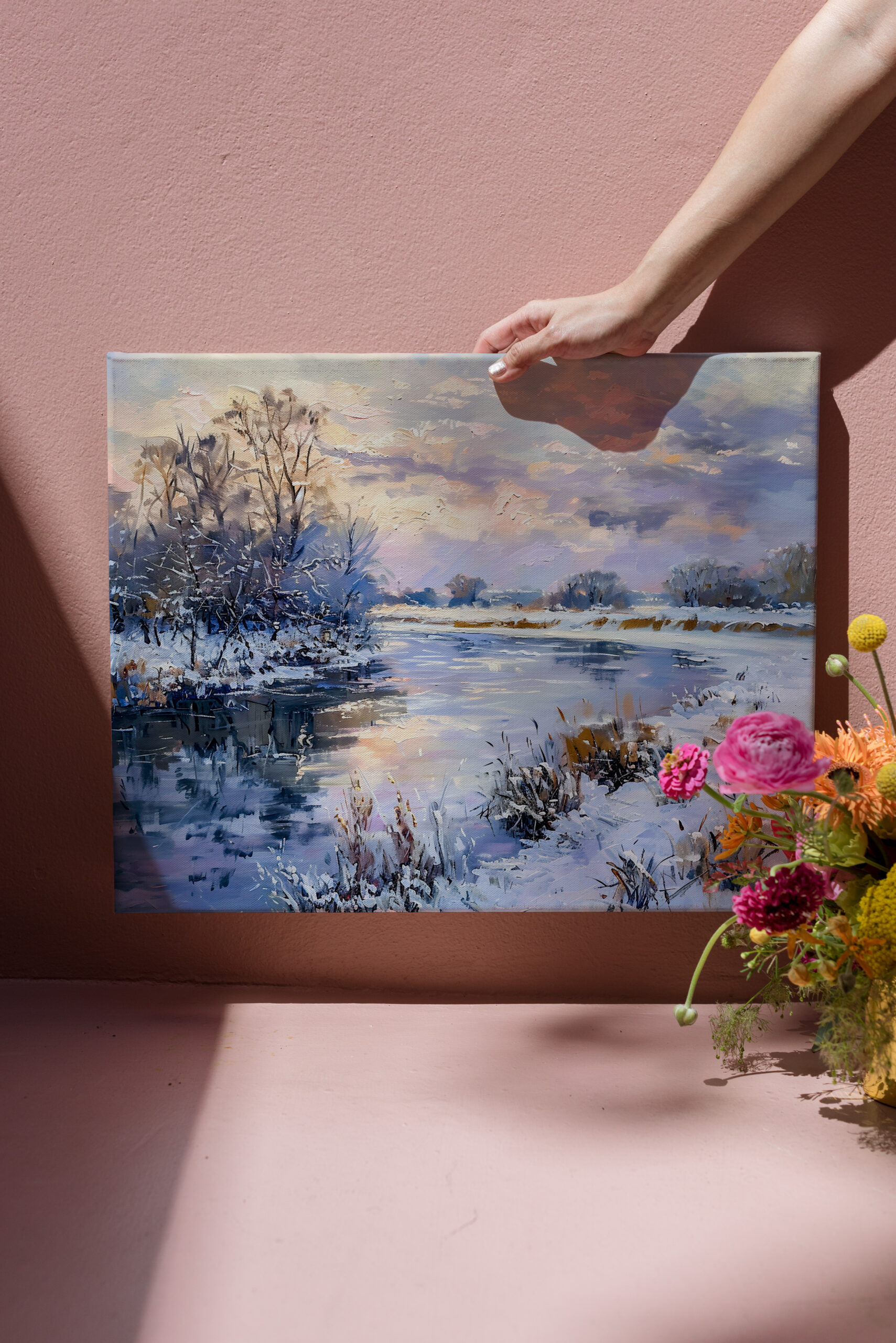 A breathtaking winter landscape of the Havel River, blanketed in snow with wild clouds and weeping willows along the icy shore. The impressionistic style captures the serene beauty and tranquility of the scene, creating a peaceful and inviting atmosphere.