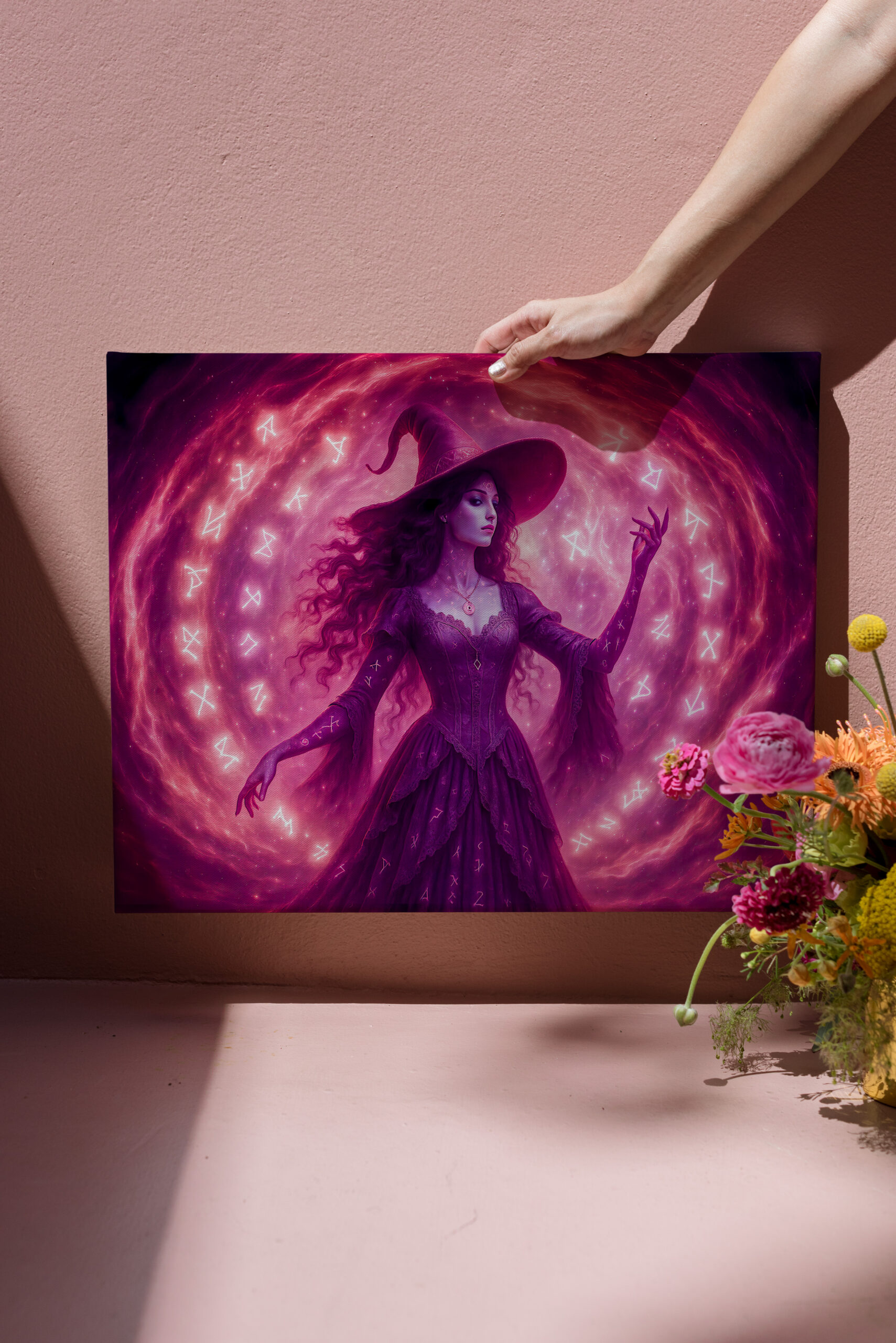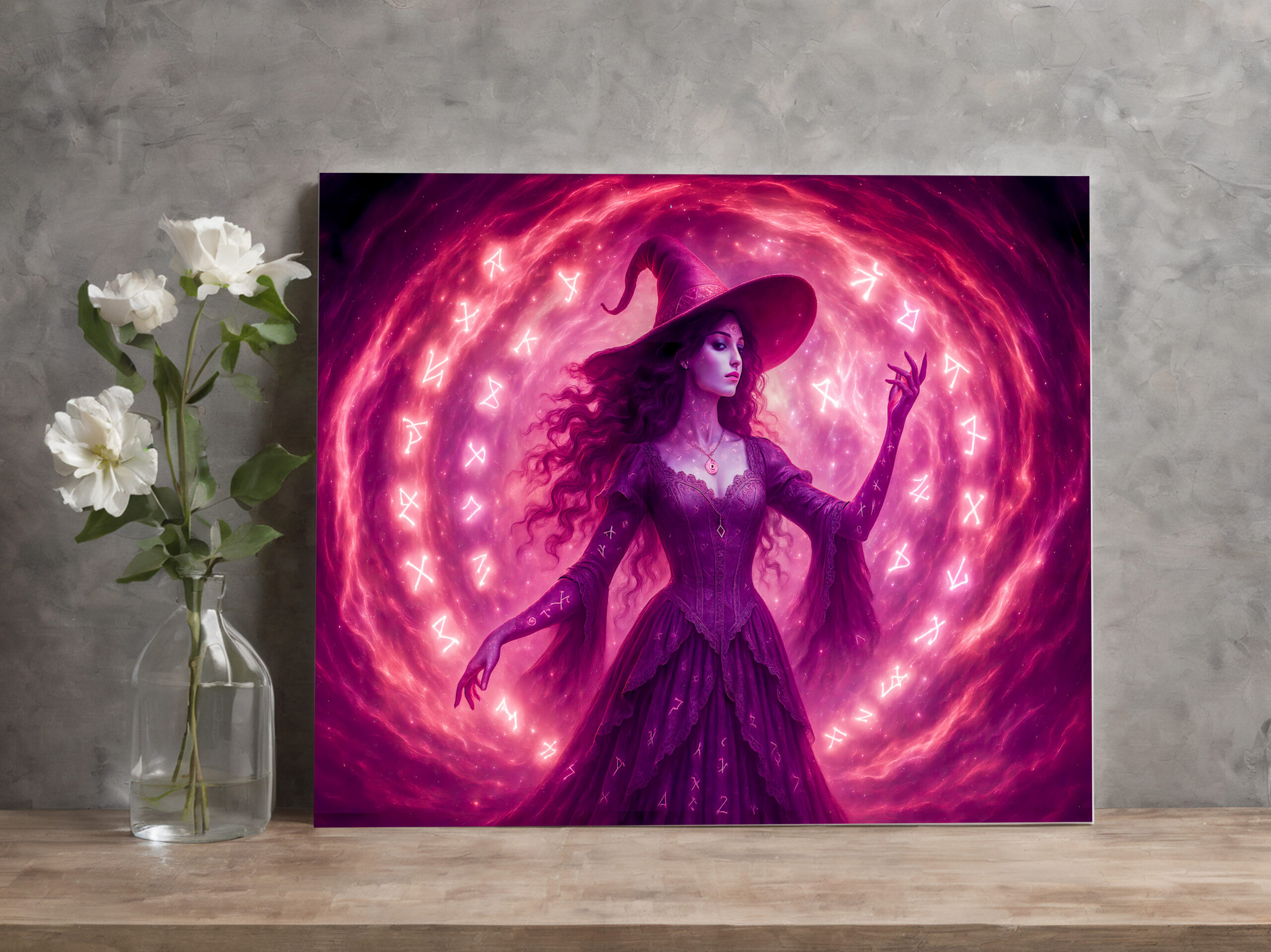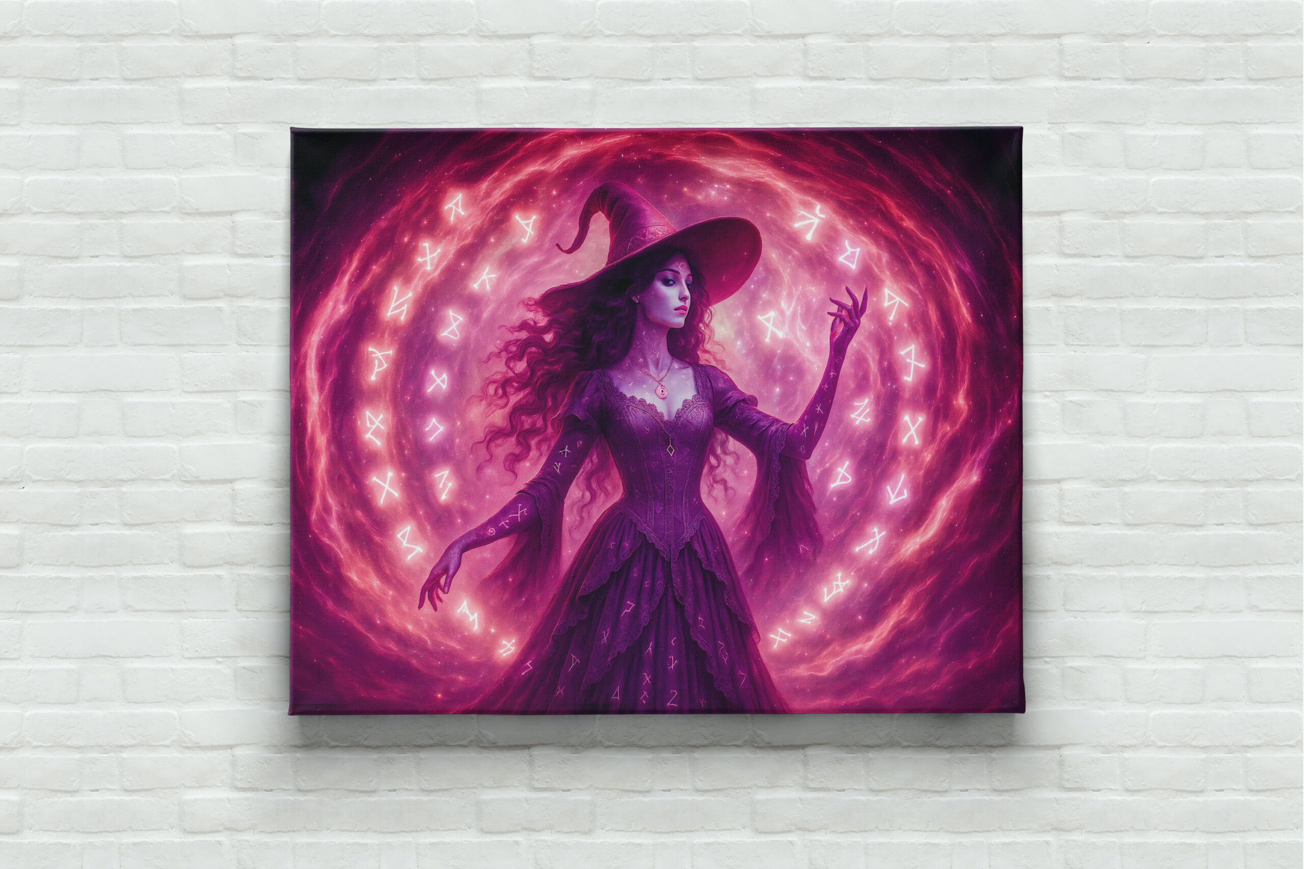 A mysterious witch in pink channels energy through a glowing circle of magical runes. Fantasy scene filled with movement and power.