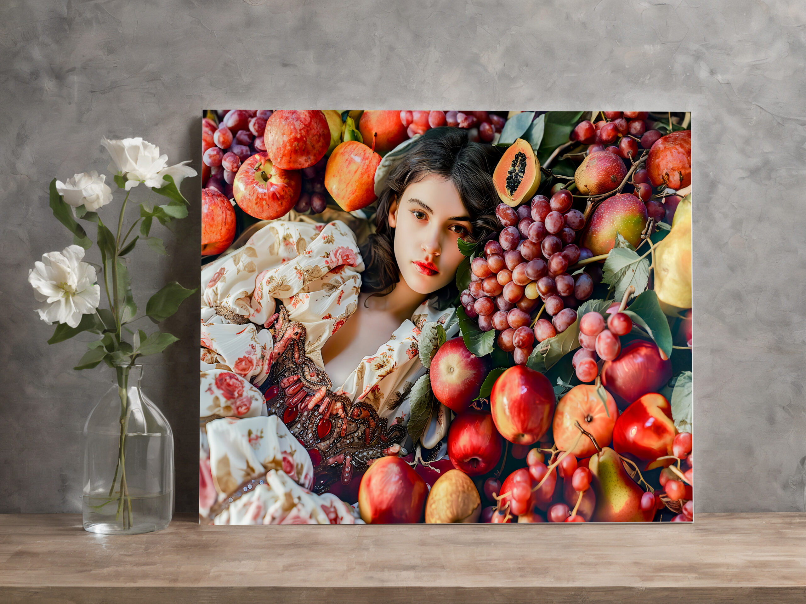 A woman poses with apples and grapes in a lush, nature-inspired portrait. The scene evokes freshness, elegance, and artistic harmony.