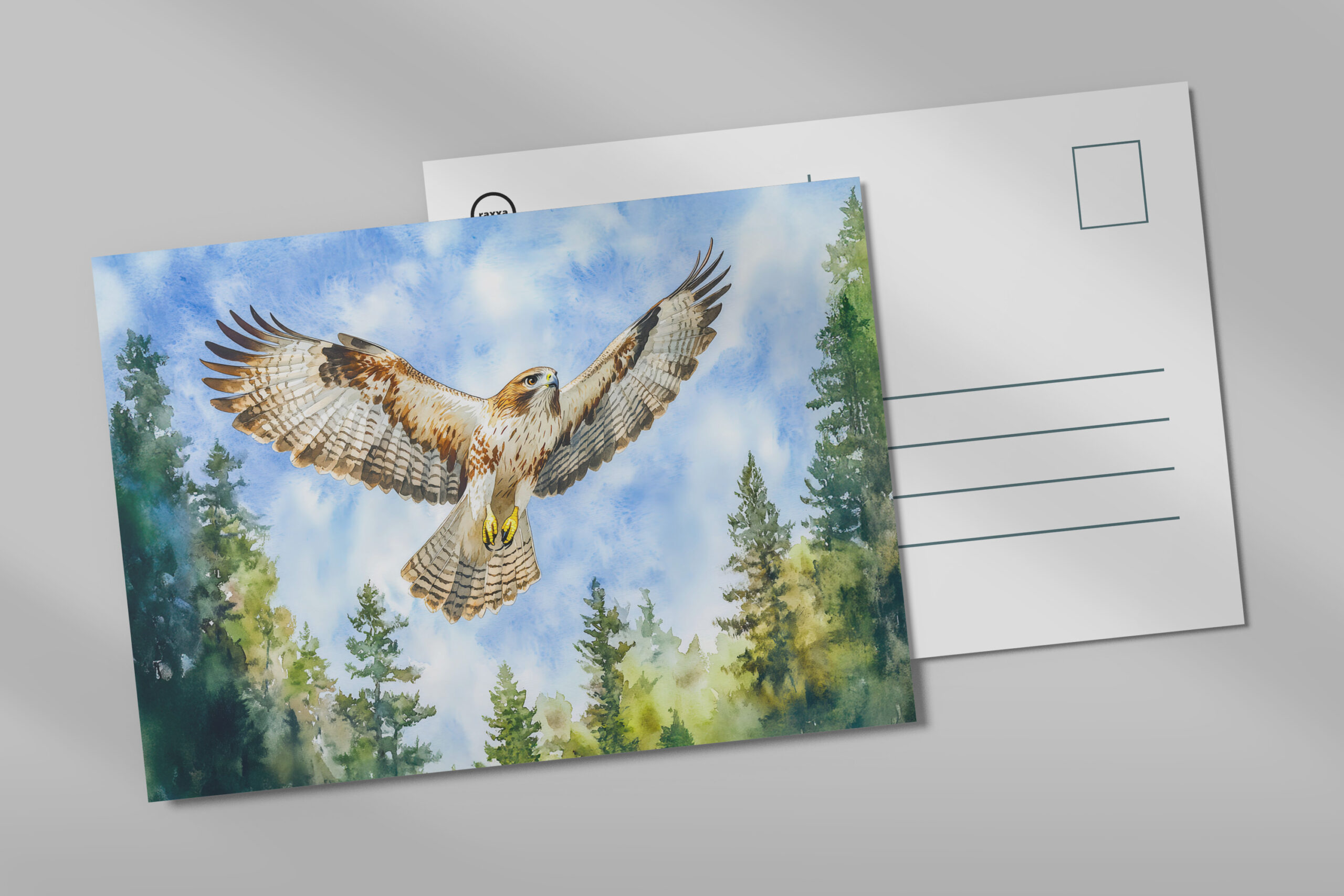 dynamic watercolor painting of a buzzard soaring above a dense pine forest, showcasing the majestic flight of this bird of prey in a natural setting. Perfect for wildlife and nature enthusiasts.