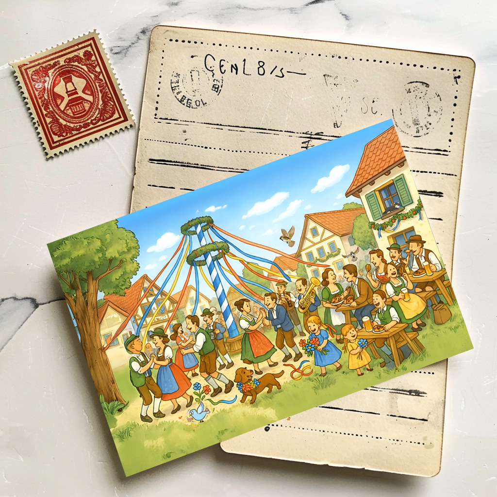 Feiern Sie die fröhliche Atmosphäre einer traditionellen Maifeier mit unserer wunderschönen, illustrierten Wandkunst! Dieses Kunstwerk zeigt ein lebhaftes Maibaumfest in einem malerischen Dorf, in dem Menschen in farbenfrohen Trachten tanzen, Musik spielen und köstliche Speisen genießen. Die detailreiche Darstellung bringt die Freude und Gemeinschaft dieses Brauchs zum Leben und eignet sich perfekt für jede Gelegenheit, sei es für Ihr Zuhause, Ihr Restaurant oder als Geschenk.