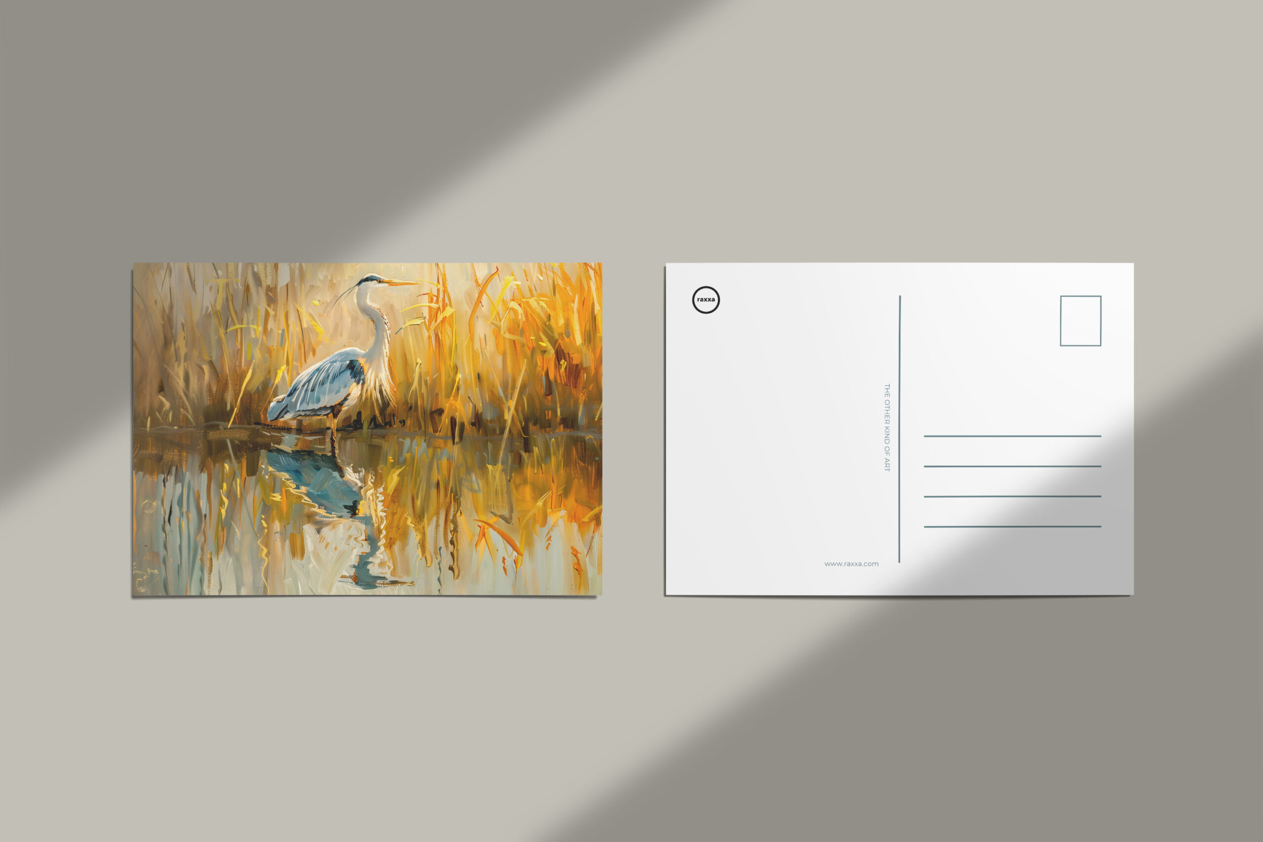 majestic heron stands still in shallow water at sunrise, reflected in the calm surface. Surrounded by reeds and bathed in soft morning light, this artwork blends wildlife elegance with impressionist brushwork.
