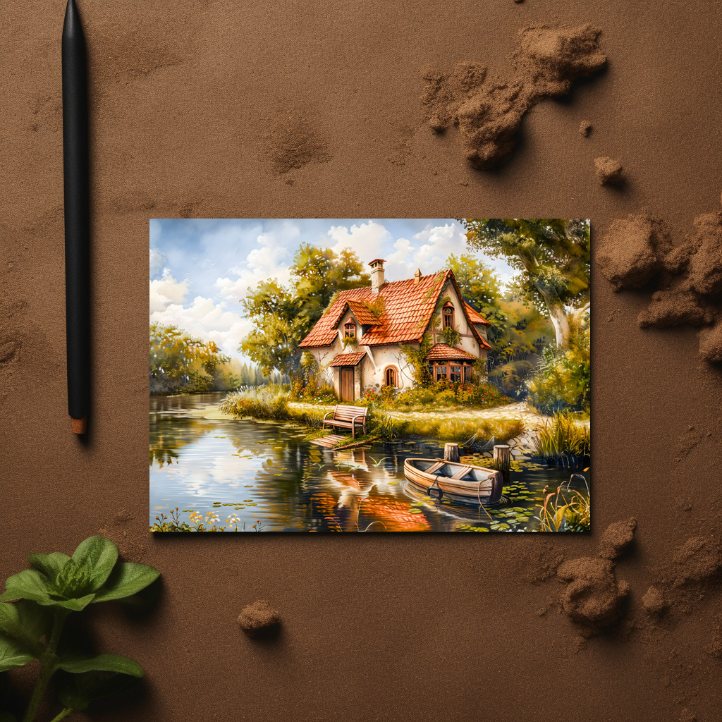 Serene illustration of a cottage by a tranquil lake, featuring a small rowboat docked by the shore. Ideal for peaceful and countryside-themed designs.