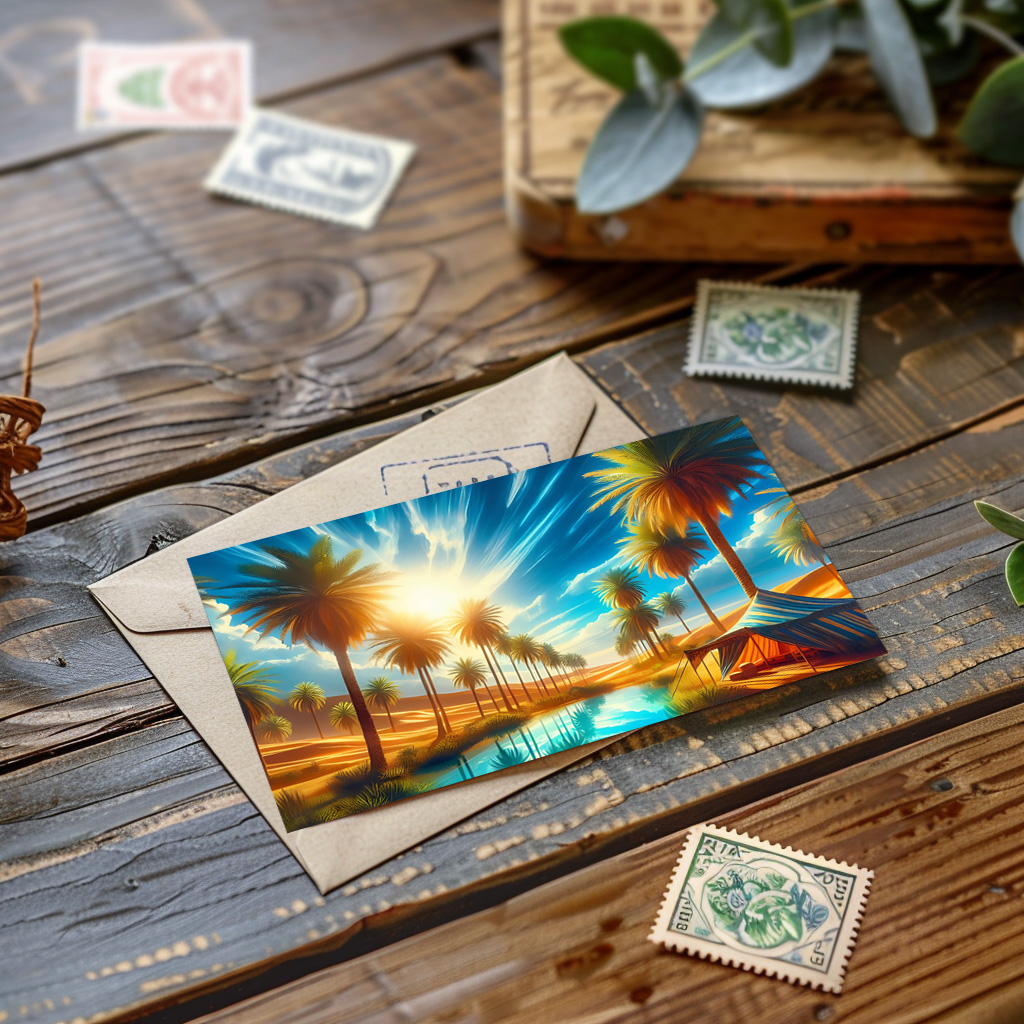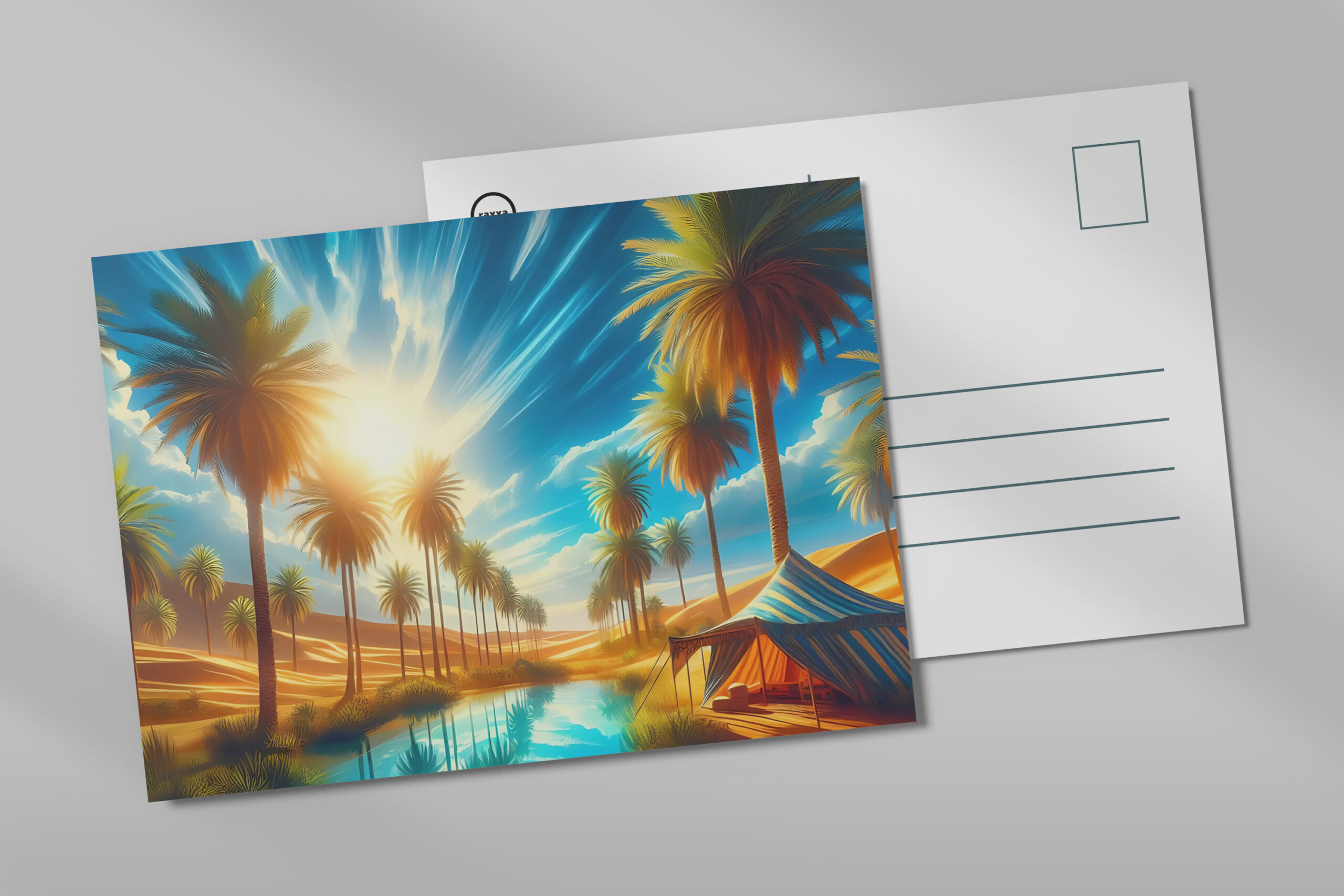 Este oasis parece sacado de un sueño, con majestuosas palmeras y aguas cristalinas. La arena lo rodea como un marco dorado, acentuando la belleza de este paraíso escondido.