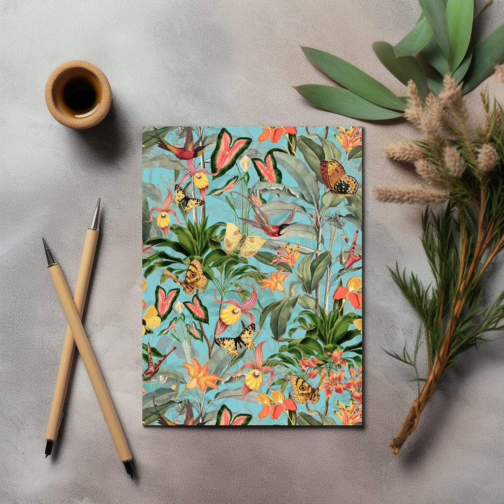 Un exótico motivo vintage turquesa con un toque tropical encanta con su esplendor natural. Flores vibrantes y exóticas en colores exuberantes florecen sobre un fondo rico en adornos de lujo. Pájaros exóticos y mariposas deslumbrantes con sus llamativos dibujos vuelan por el diseño, añadiendo un toque juguetón. Este motivo captura la magia de la naturaleza tropical y desprende una elegancia atemporal que hechiza los sentidos y evoca paraísos lejanos y exóticos.