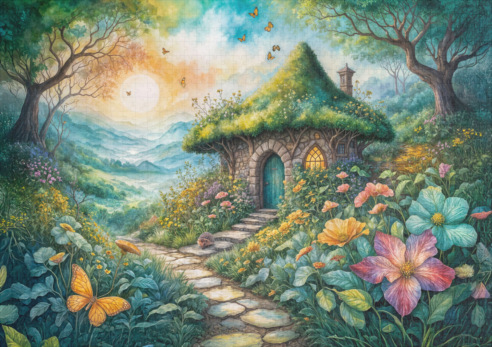 A picturesque cottage nestled by a tranquil path, surrounded by lush greenery, vibrant flowers, and a wooden bridge, creating a magical and peaceful atmosphere.