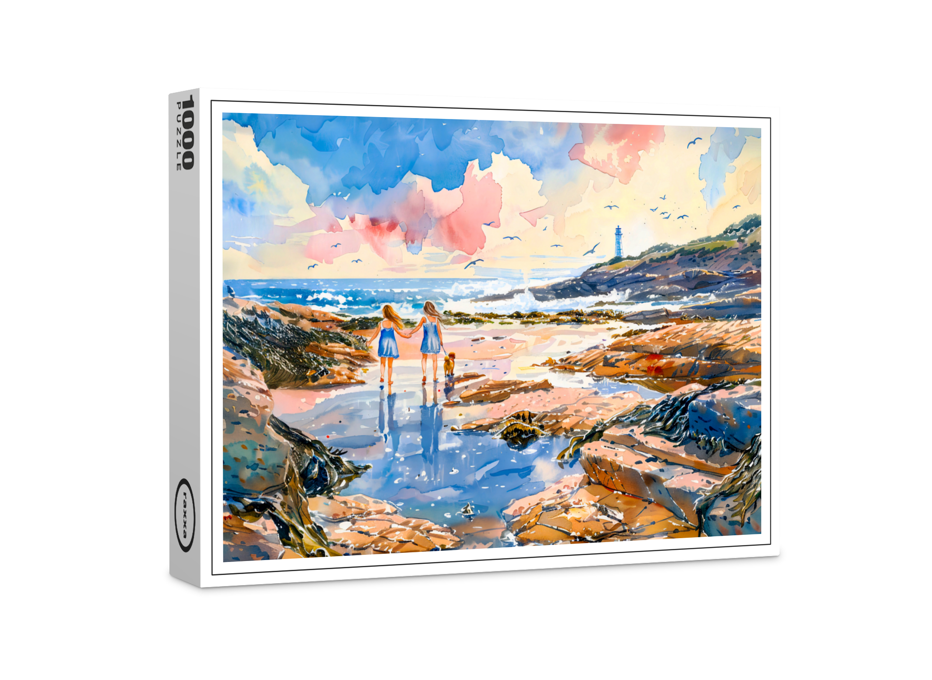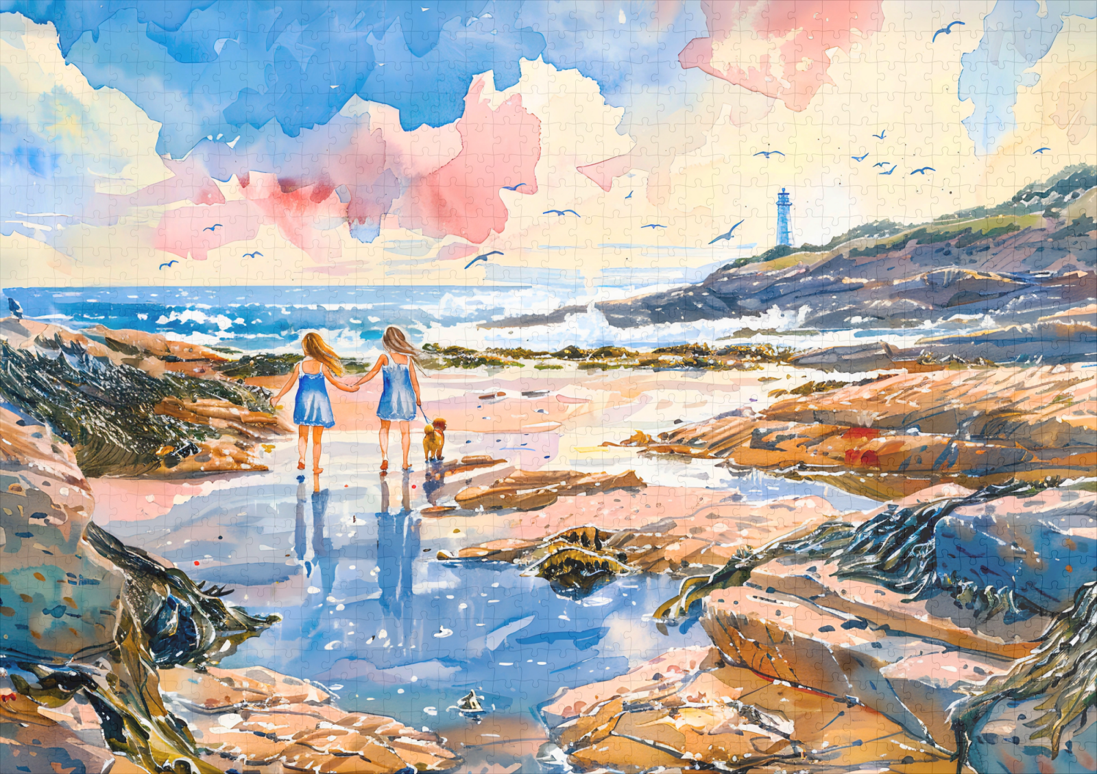 watercolor painting of two girls and their dog running along a rocky beach in summer, with a lighthouse in the background