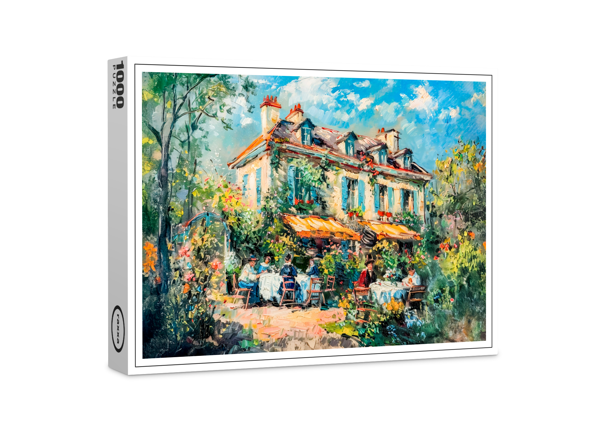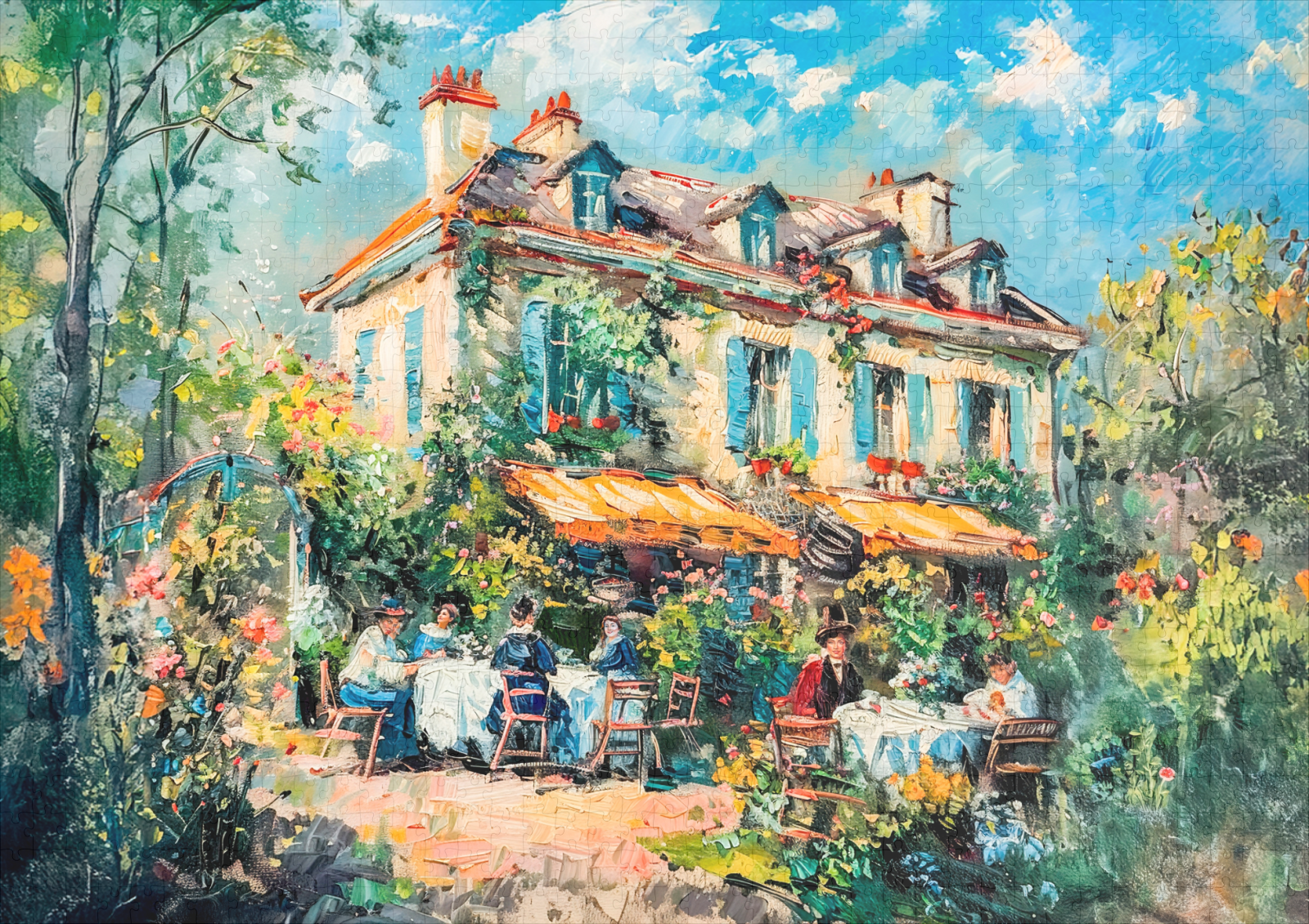 Impressionist painting of a house with people gathered at garden tables, enjoying leisure time in a lush blooming setting