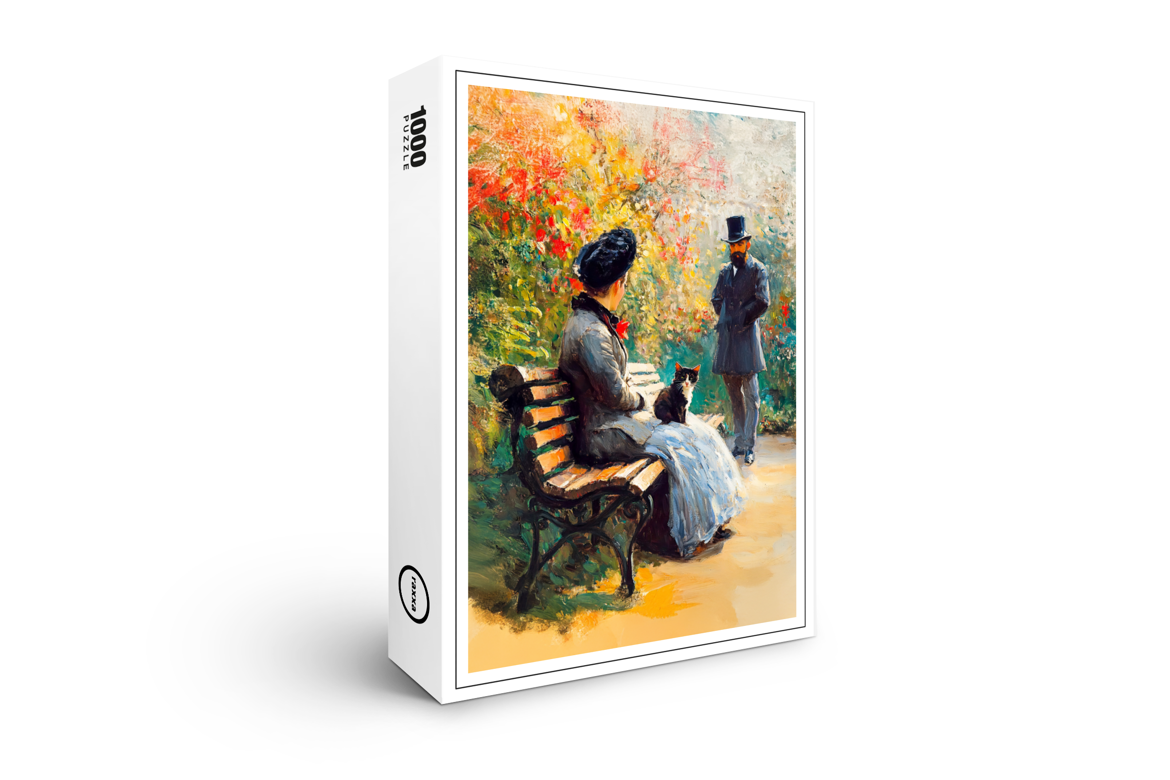 An impressionistic oil painting of a man and woman sitting in a garden with a cat resting on one’s lap. A warm and serene depiction of companionship and nature.