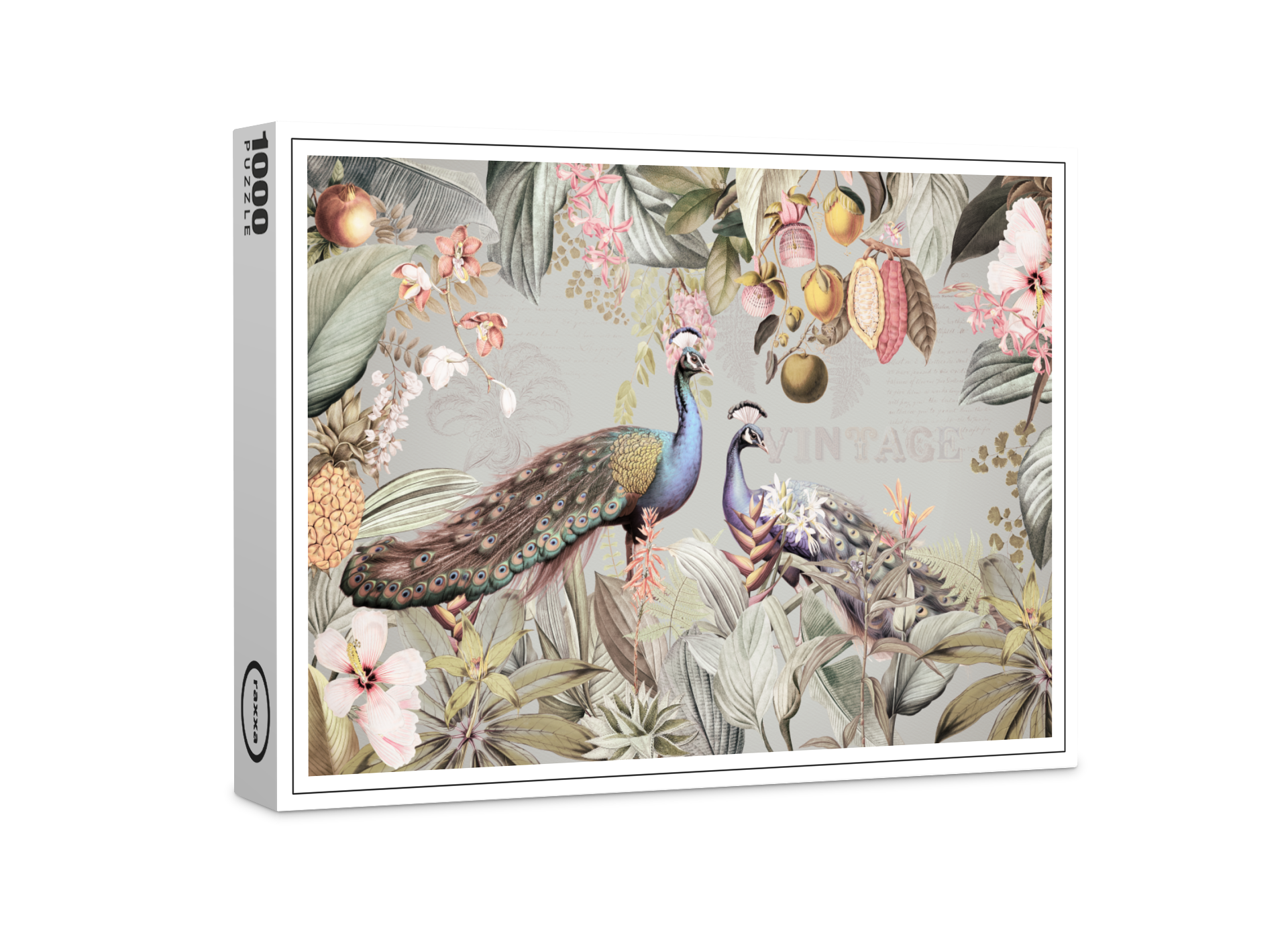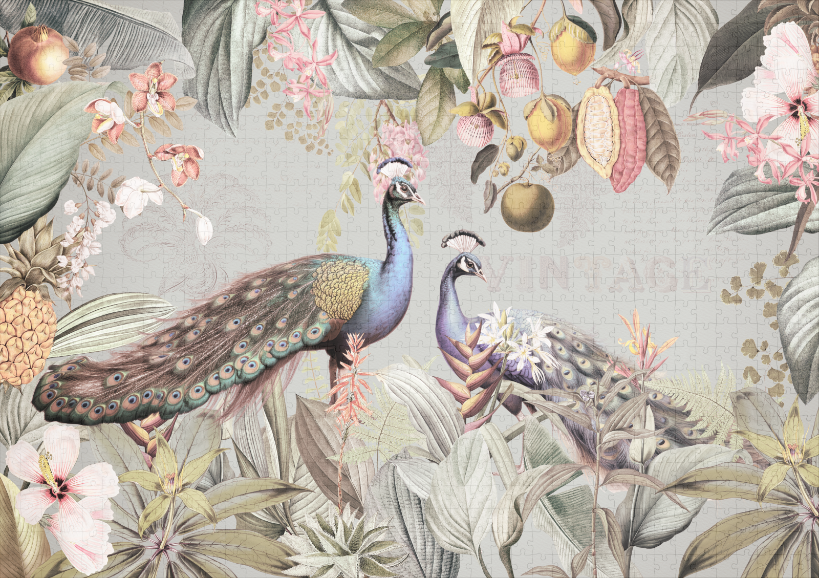 En esta ilustración vintage, elegantes pavos reales ocupan el centro de la escena, rodeados de un exuberante marco de flores antiguas, frutas tropicales y hojas. El fondo, de un suave tono gris, acentúa el ambiente tropical y exótico de la escena. El plumaje de los loros rebosa exuberancia y colorido y contrasta con el delicado fondo pastel. Esta composición transporta al espectador a una época pasada de elegancia y al atractivo de lejanos y exuberantes paraísos tropicales. Los intrincados detalles y la vibrante paleta de colores hacen de esta ilustración una cautivadora instantánea de la belleza de la naturaleza.