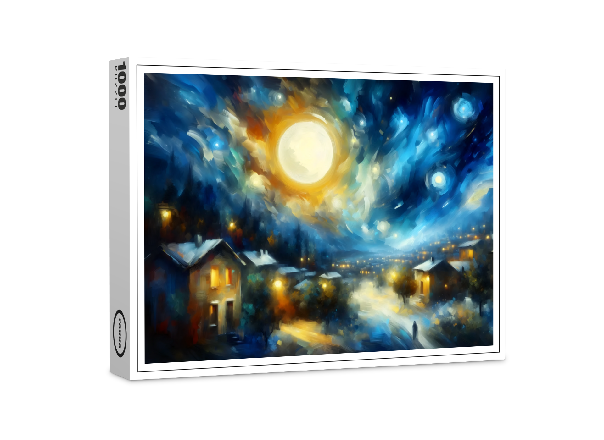 Ein Dorf liegt unter einem strahlenden Mond, dessen Licht sich in wirbelnden Blau- und Goldtönen über den Himmel ergießt. Häuser leuchten warm, während kleine Lichter die Nacht durchziehen. Eine einsame Figur wandert durch die ruhige, träumerische Szenerie – ein Moment zwischen Stille und Magie.