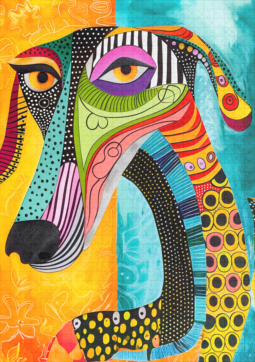 Expressive colors and abstract shapes bring this pop-art dog portrait to life, ideal for unique home decor