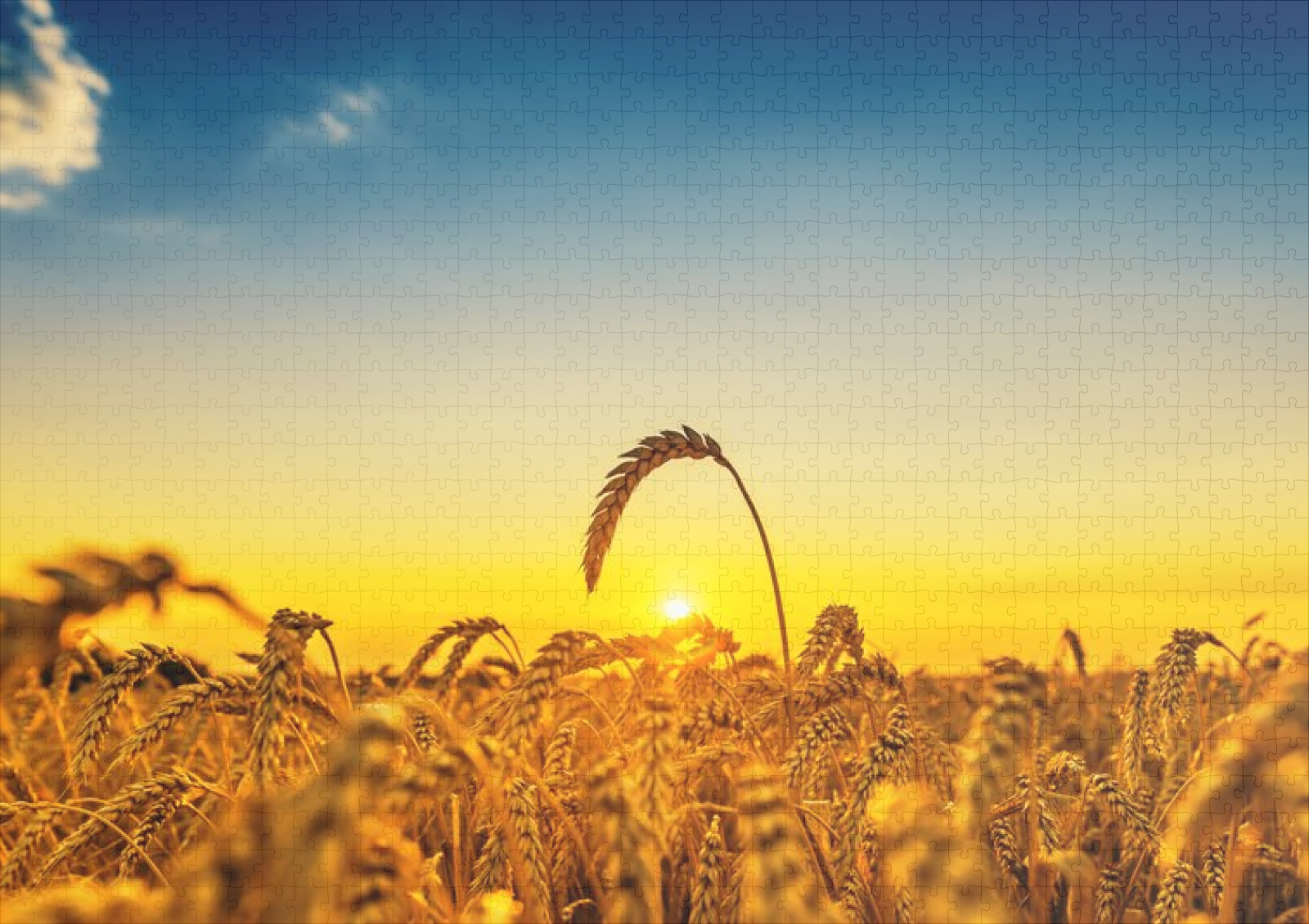 Puesta de sol sobre un campo agrícola con una cosecha dorada