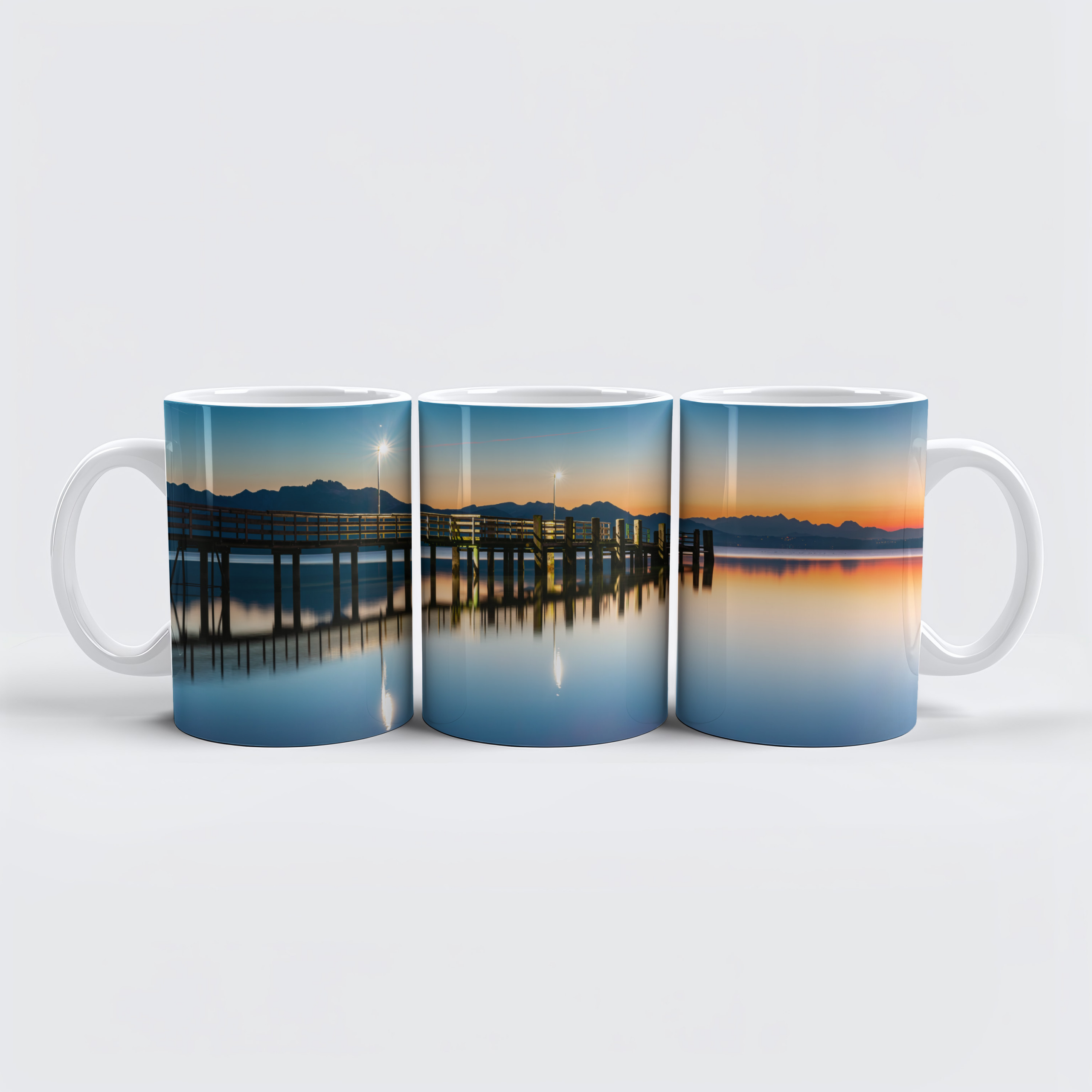 Bootssteg in Chieming am Chiemsee in der Abenddämmerung mit Blick auf die Alpen
