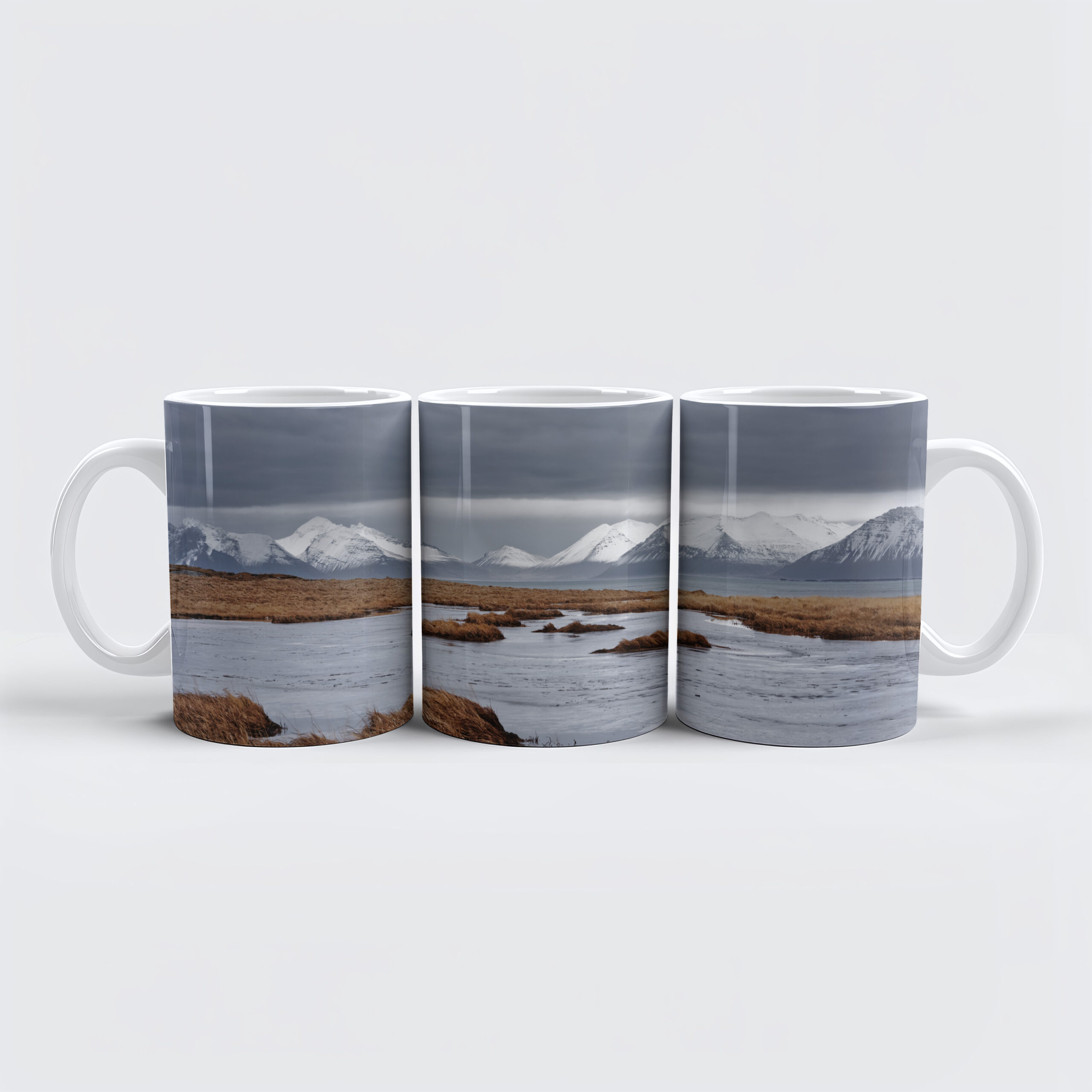 La vista pasa por encima de un lago helado con hierba rojiza y una bahía marina hasta una cordillera nevada con una formación nubosa contrastada, las briznas de hierba son parcialmente movidas por el viento, gran efecto de profundidad - Localización- Islandia, costa sur