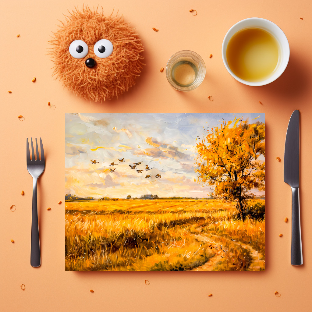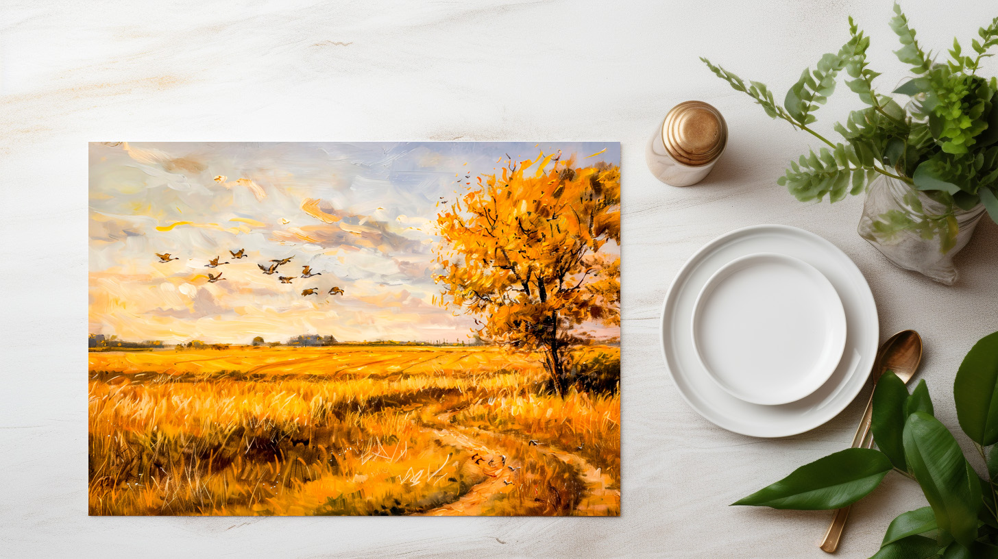A golden autumn scene with birds in flight over fields and a winding path beneath colorful trees. This warm impressionist painting reflects the spirit of seasonal change and freedom.