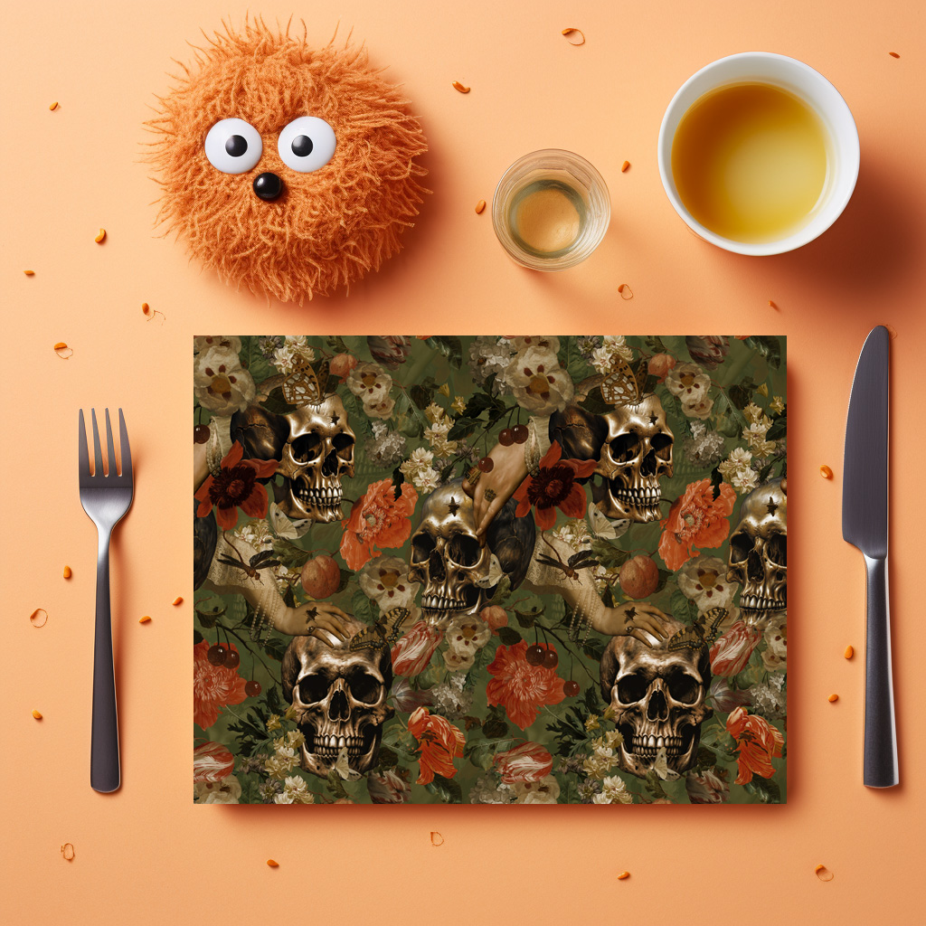 Un diseño antiguo de época en un suave y desgastado color verde sepia que captura la magia de tiempos pasados. Este diseño combina ingeniosamente calaveras detalladas con motivos florales antiguos que brillan en colores apagados y terrosos. Las calaveras irradian una atmósfera misteriosa, mientras que las flores antiguas transmiten una belleza atemporal y nostalgia. El conjunto crea una atmósfera tenebrosa que transporta al espectador a un mundo de elegancia antigua y magia vintage, donde se funden la historia y la belleza.