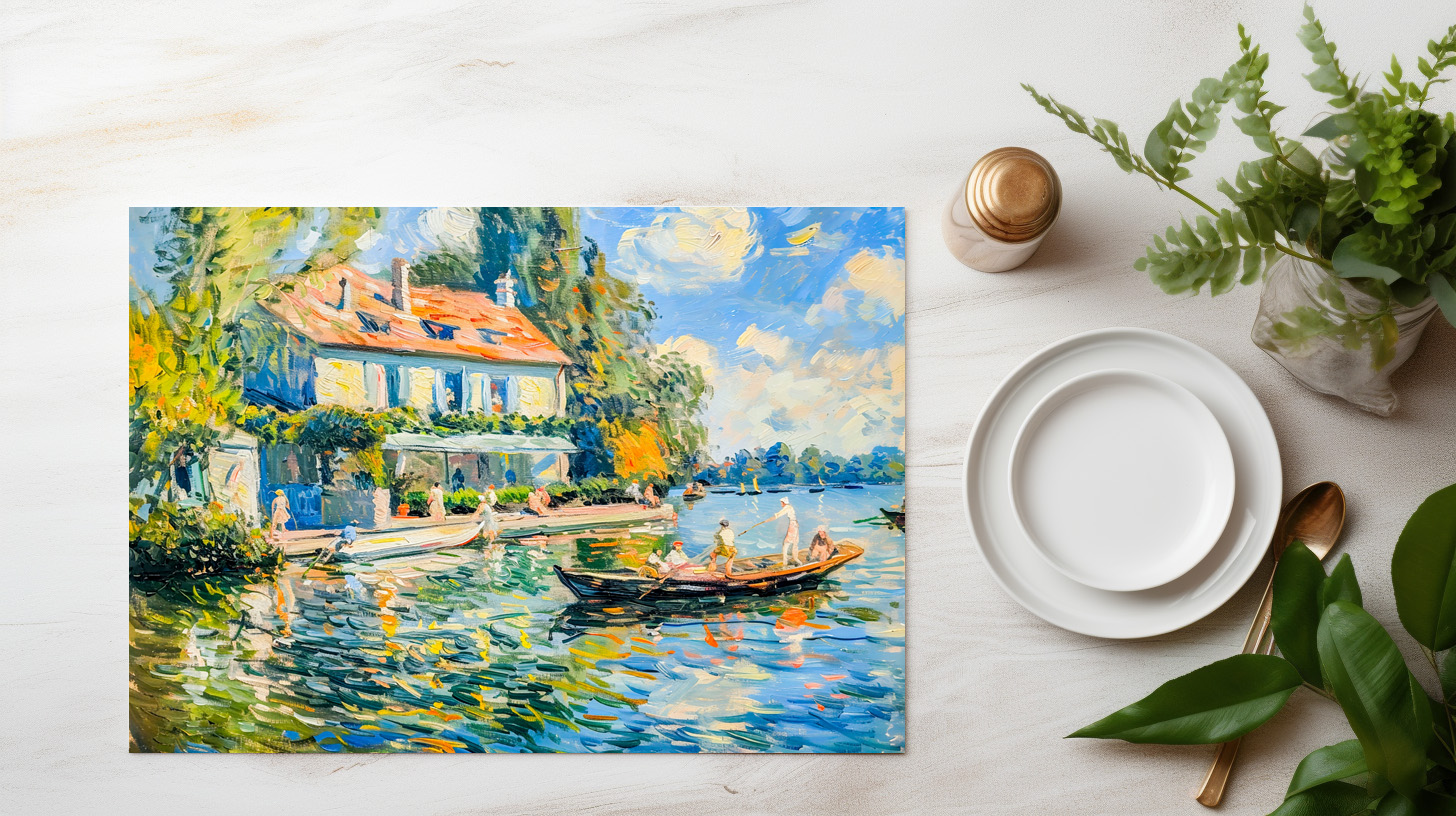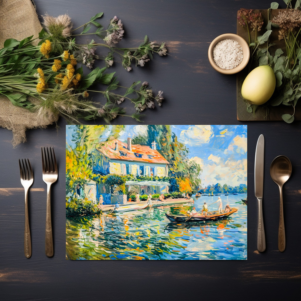 Impressionist painting of a house by the lake, with a small boat floating on the calm water, surrounded by lush greenery.