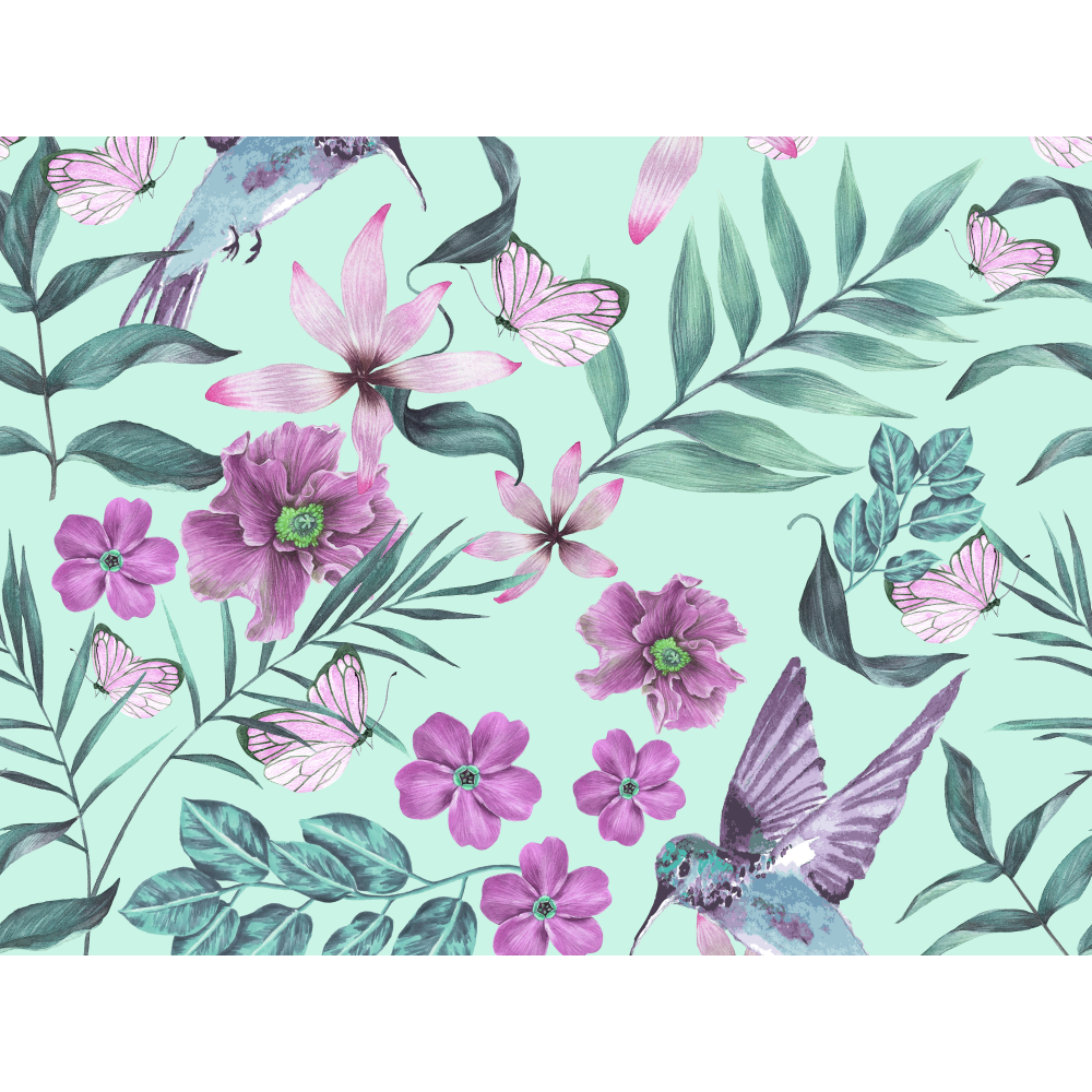 Encantador estampado de flores y colibríes en colores pastel azul menta y rosa, perfecto para la moda veraniega y la decoración moderna del hogar.