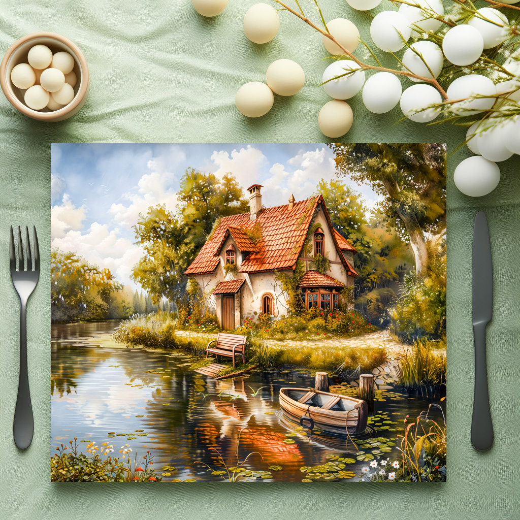 Serene illustration of a cottage by a tranquil lake, featuring a small rowboat docked by the shore. Ideal for peaceful and countryside-themed designs.