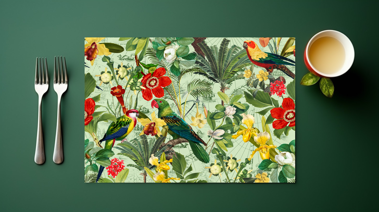 Un exuberante estampado verde vintage inspirado en el exotismo tropical crea un fascinante telón de fondo. Unos vibrantes loros verdes hacen alarde de su colorido plumaje y su alegre encanto sobre un exuberante fondo verde. Las flores en diferentes tonos de verde complementan el diseño y añaden elegancia natural. Este motivo desprende una atmósfera atemporal y lujosa e invita al espectador a sumergirse en el fascinante mundo de la belleza tropical y la fauna exótica, donde la naturaleza florece en todo su esplendor.