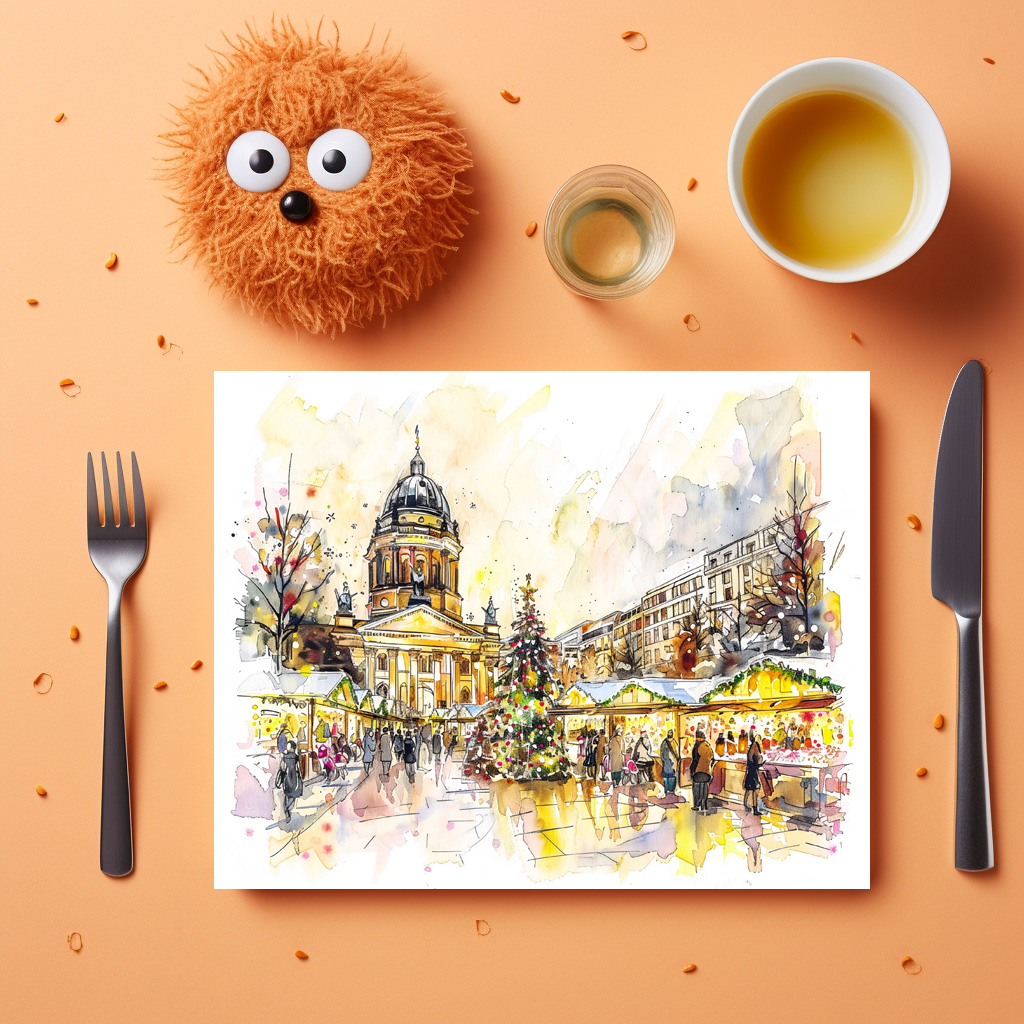 vibrant watercolor illustration of a bustling Berlin Christmas market, capturing the festive spirit with a beautifully decorated tree and historic architecture. Gendarmenmarkt