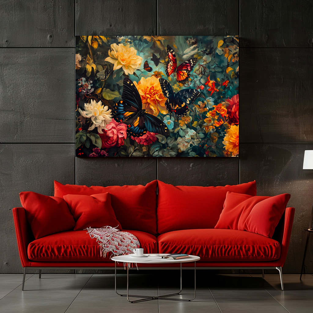 Watercolor illustration of colorful butterflies resting among vibrant dahlias and blooming roses in a lush floral garden.