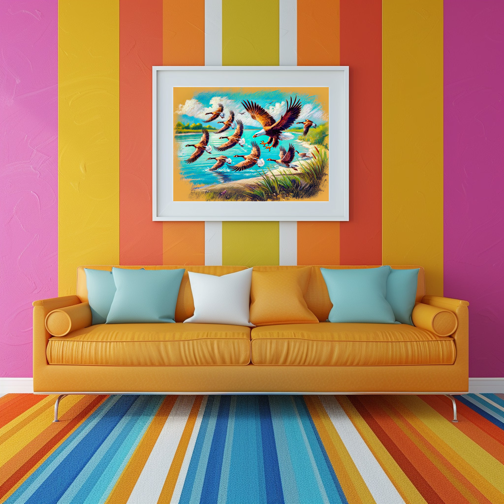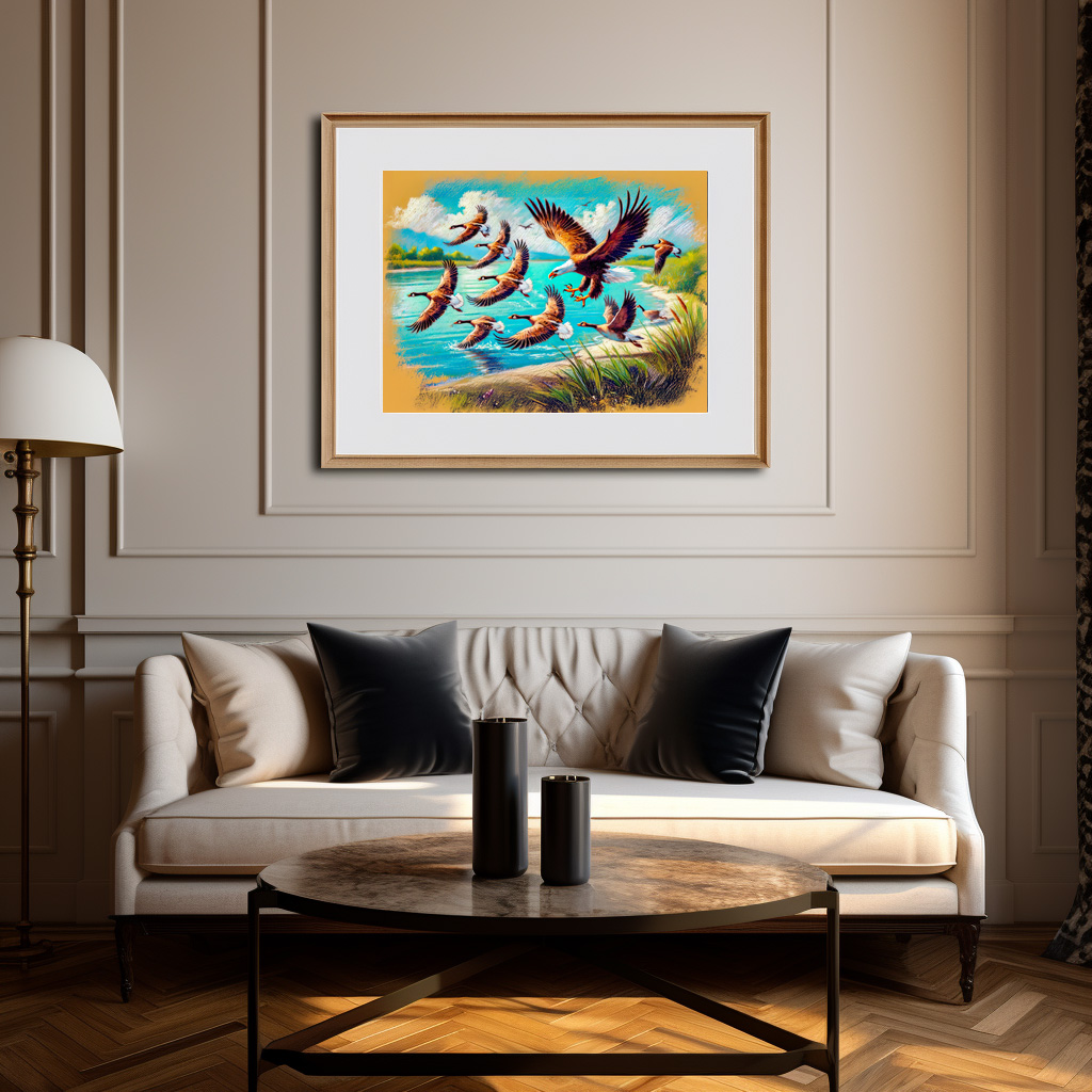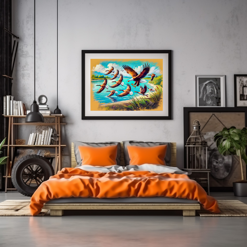 chases wild geese over a serene lake, displaying its aerial prowess. This pastel chalk drawing captures the dramatic chase and the raw energy of wildlife in action