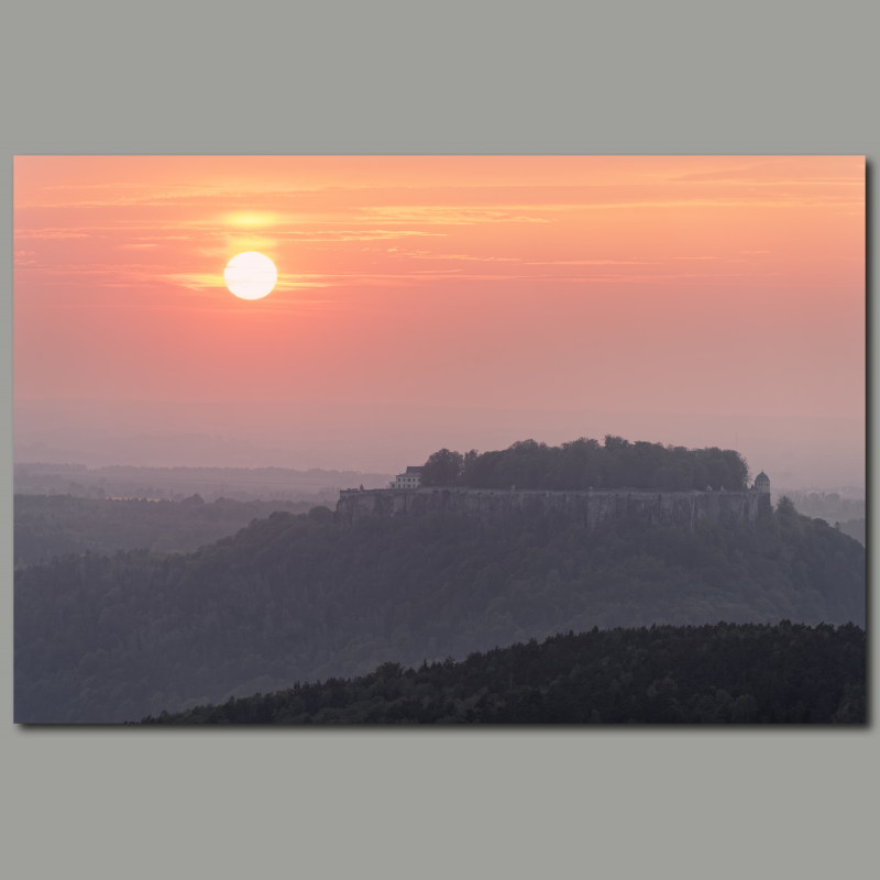 Elbsandsteingebirge – Sonnenuntergang an der Festung Königstein mit spektakulärem Abendlicht in Gelb- und Orangetönen, leichter Dunst, Detailaufnahme – Location: Deutschland, Sachsen, Elbsandsteingebirge, Sächsische Schweiz, Königstein