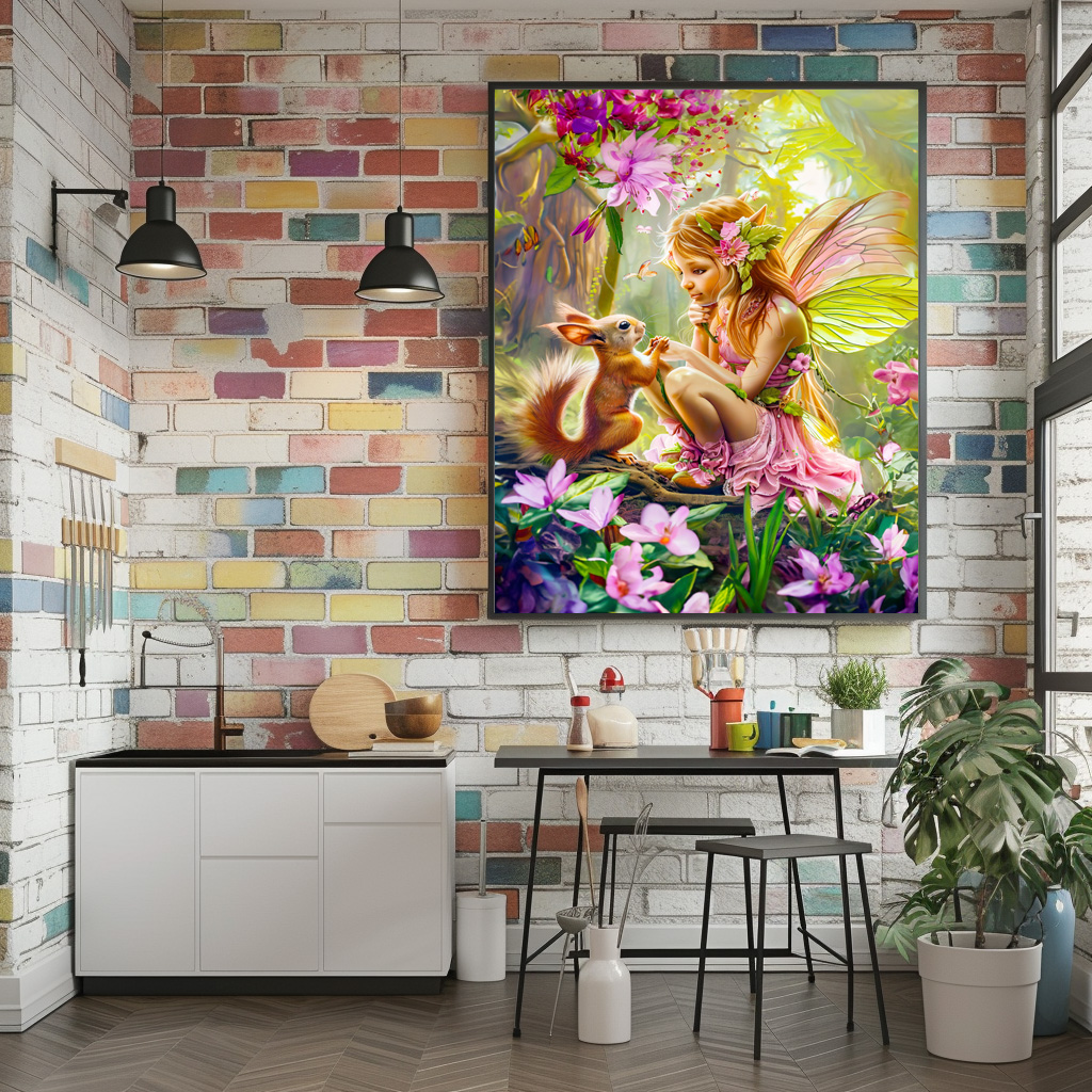 joyful flower fairy sits with her playful squirrel friend in a blooming forest. A colorful pastel chalk artwork celebrating natures beauty.