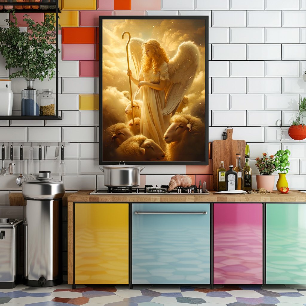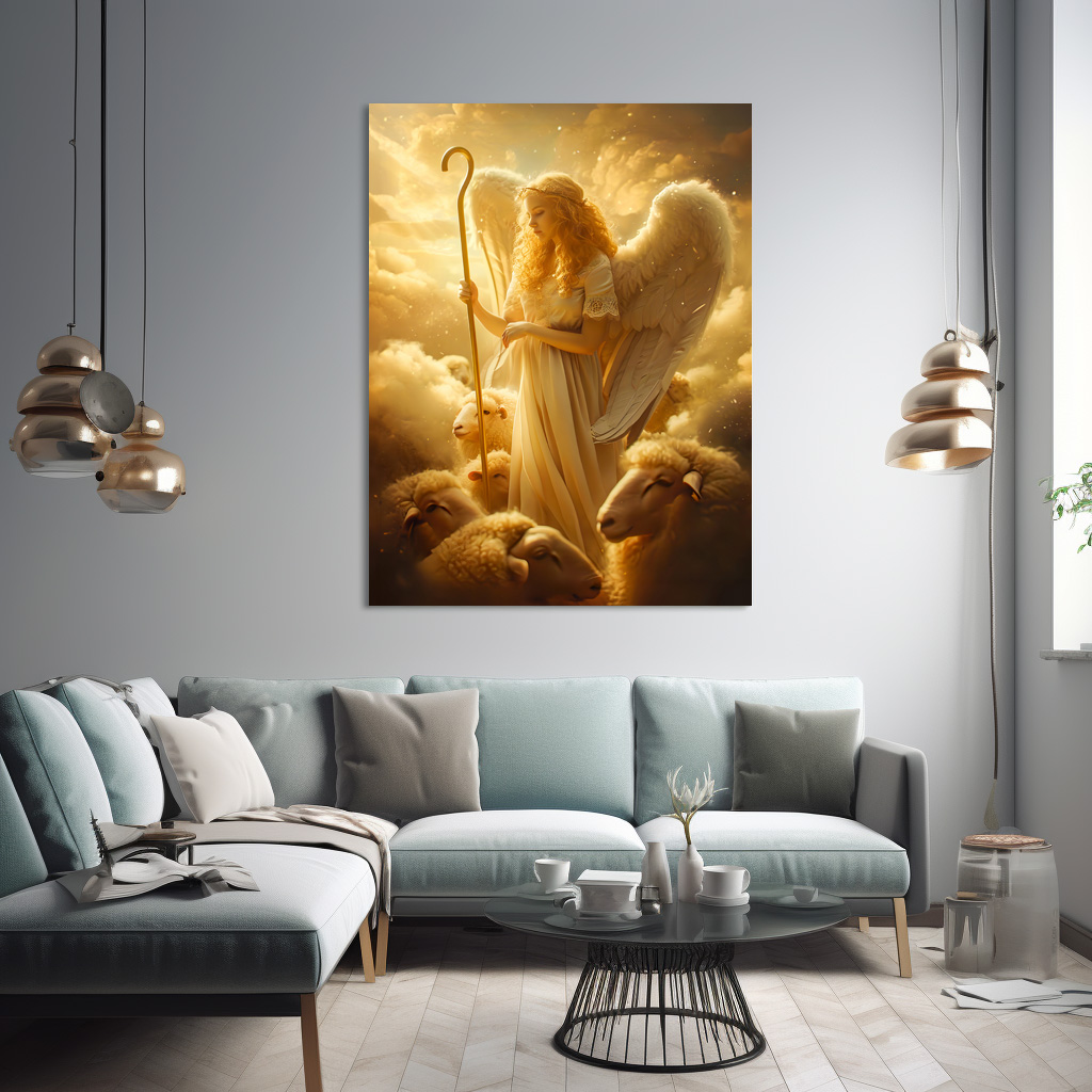 illustration portraying an angel surrounded by gentle sheep, holding a shepherds crook, symbolizing divine protection and guidance over the peaceful flock. Experience the heavenly charm of this pastoral scene