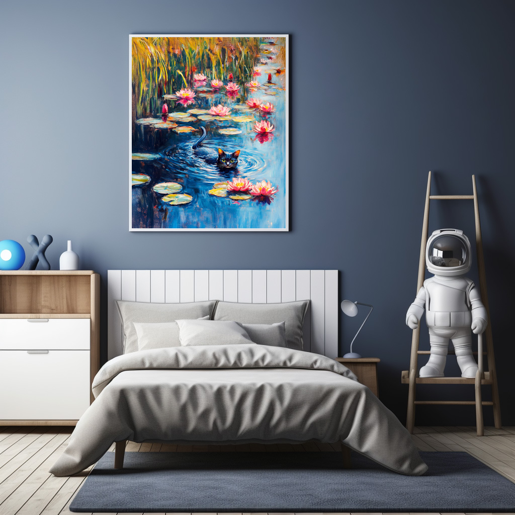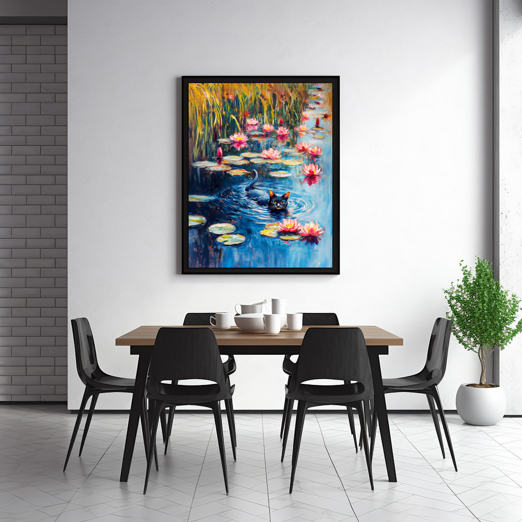 "Impressionistic Oil Painting of Black Cat in Lily Pond" by Anja Frost