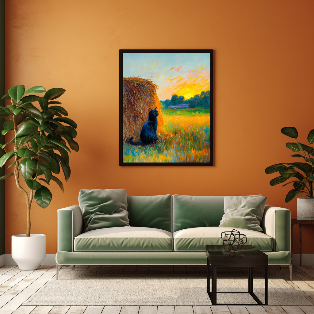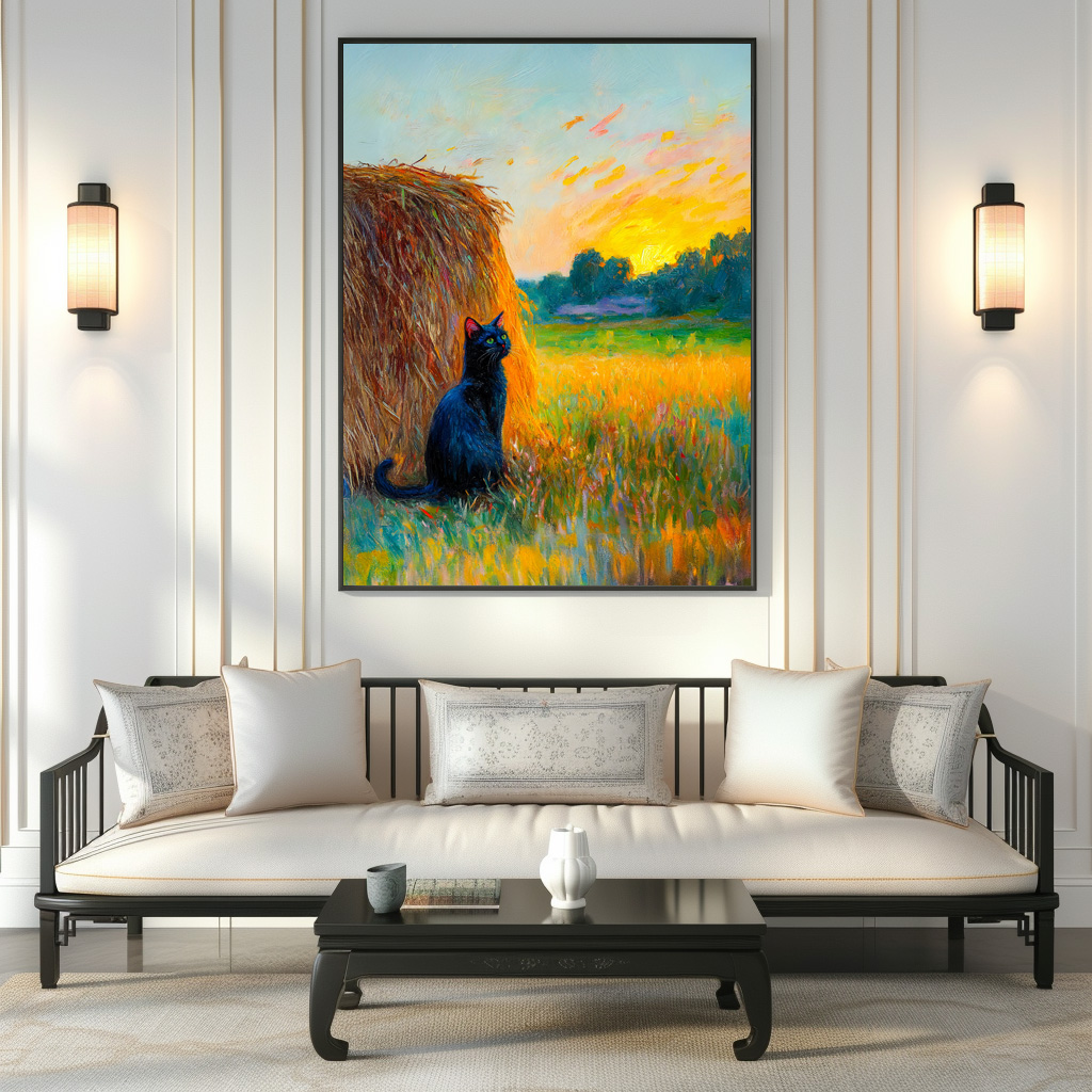 An impressionistic oil painting featuring a cat sitting beside a haystack on a meadow during a golden sunset. Warm tones and textured brushstrokes evoke a serene countryside scene.