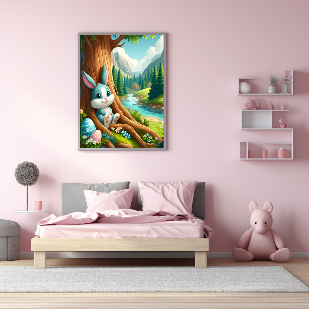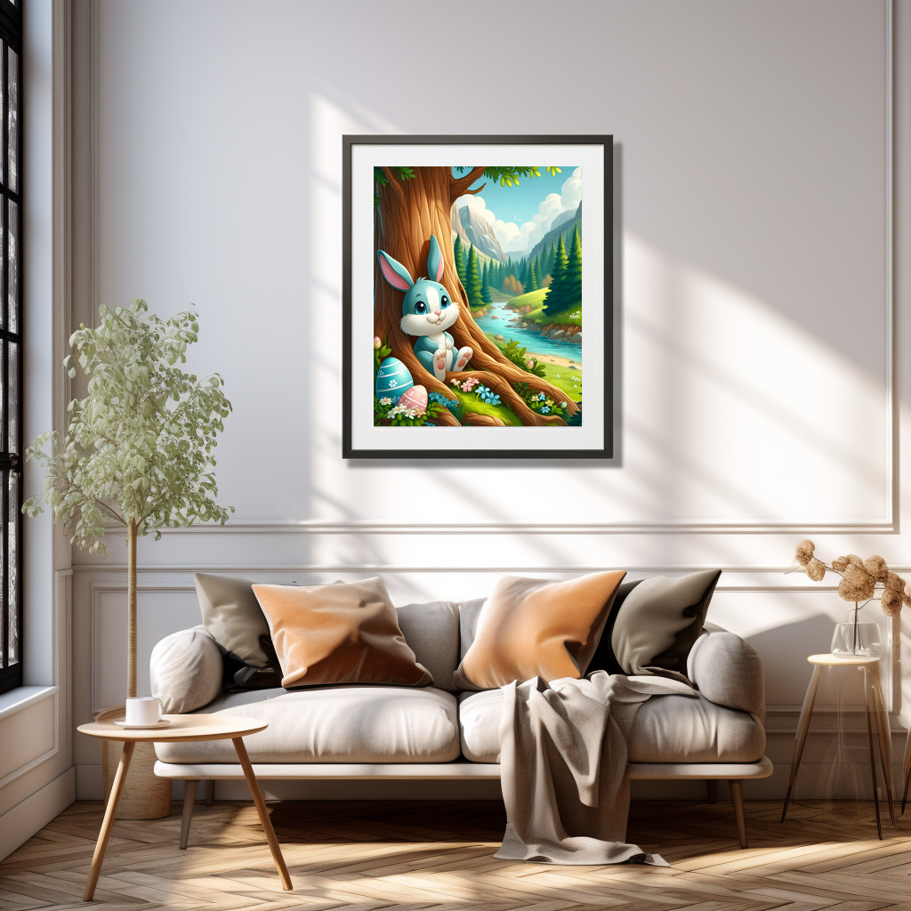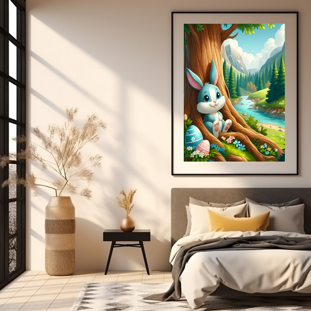 Dans un paysage enchanteur, d'adorables lapins de Pâques présentent fièrement des œufs de Pâques multicolores. Entourée de verdure luxuriante, la scène respire la joie du printemps. Les lapins sourient avec amour et les œufs brillent de couleurs vives, prêts à célébrer la fête de Pâques.