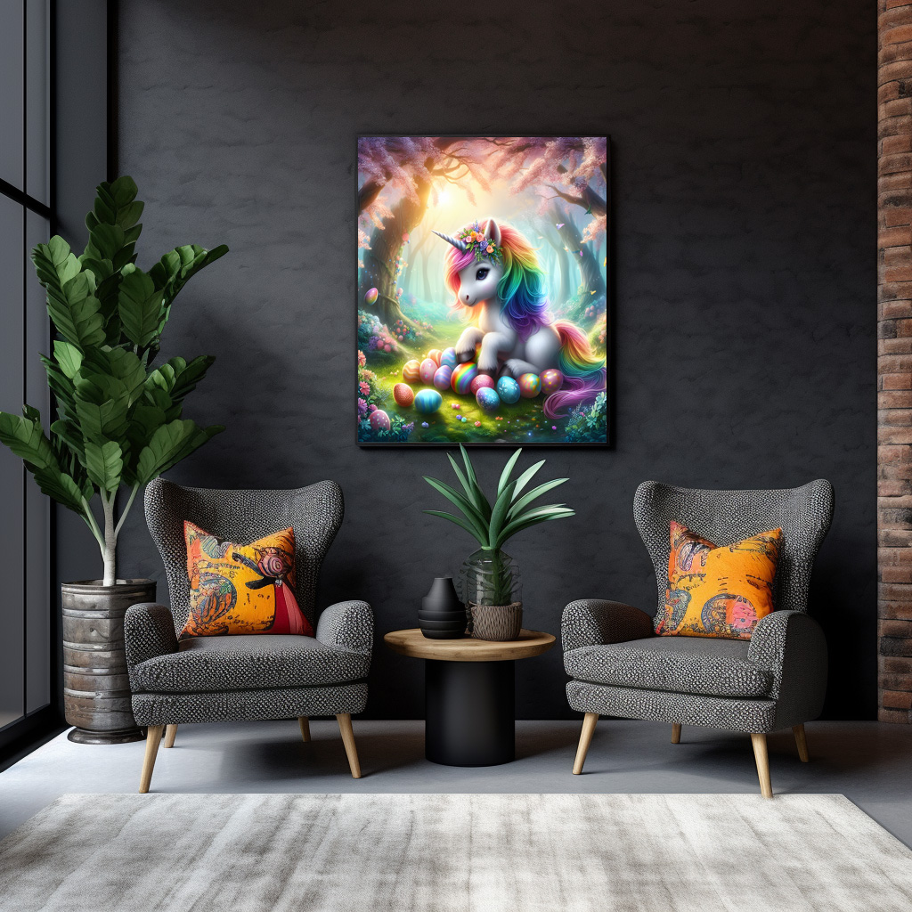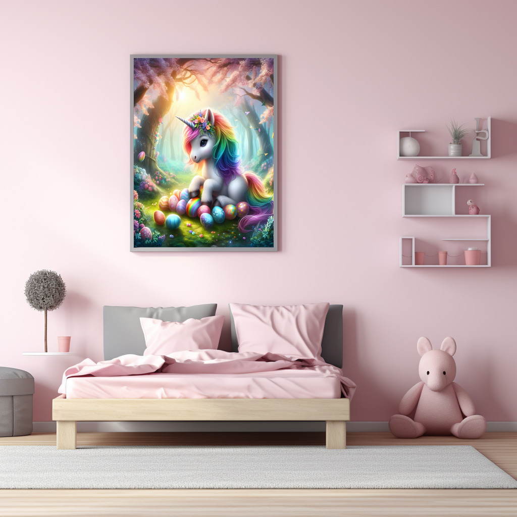 Une adorable licorne brille dans des couleurs pastel, entourée d'œufs de Pâques lumineux. Un arc-en-ciel coloré décore l'arrière-plan et renforce l'atmosphère magique. La licorne regarde doucement au loin, entourée de la gaieté et de la magie des prochaines fêtes de Pâques.